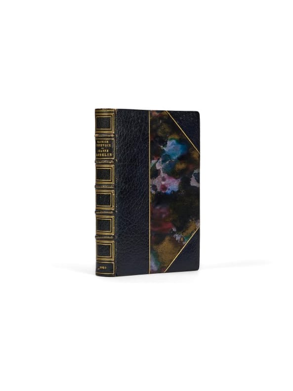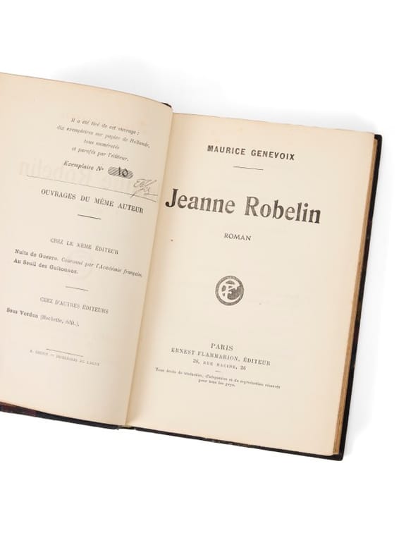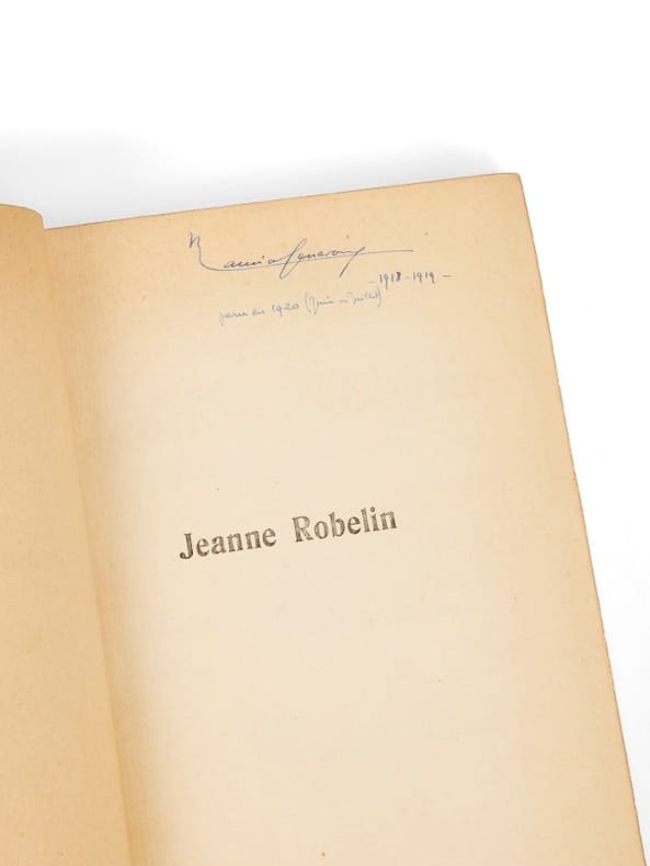 Jeanne Robelin est la première tentative romanesque de Maurice Genevoix : il dessine le portrait d'une jeune femme et évoque, sous le prétexte d'une intrigue amoureuse, la vie des civils à l'arrière. Il reviendra sur cette expérience dix ans plus tard, dans H.O.E. Ce premier roman ne constitue pas directement un témoignage de ce que Genevoix a vécu sur le front, qu'il a à cette date relaté dans Sous Verdun (1916), Nuits de guerre (1917) et Au Seuil des Guitounes (1918), et alors qu'il prépare le quatrième de ses cinq récits de guerre, La Boue. Genevoix confiera plus tard dans un entretien : « On ne vit pas une telle expérience sans y laisser beaucoup de soi. L'esprit est traumatisé et l'on éprouve le besoin de raconter, de partager. Cela a duré longtemps et puis un jour, j'ai écrit Jeanne Robelin. Ce n'était déjà plus la guerre puisque l'action se passait à l'arrière. Ensuite, ce fut Rémi des Rauches, un roman où la guerre était enfin absente. J'étais délivré ». Avant ce premier « vrai » roman de la délivrance, Genevoix bouclera sa pentalogie avec La Boue en 1921 et Les Eparges en 1923. Précieux exemplaire, établi en demi-reliure de maroquin bleu à coins, comme une grande partie des exemplaires - souvent sur beaux papiers - conservés dans sa bibliothèque. De la bibliothèque de Maurice Genevoix, aux « Vernelles », avec ex-libris.