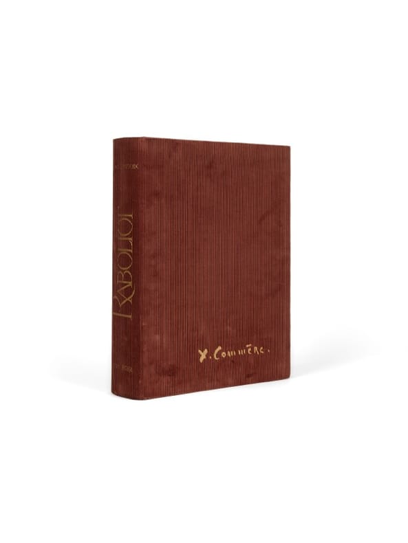 Le principe du braille est d'utiliser le sens du toucher pour l'écriture et la lecture au moyen de points en relief : il doit son nom à Louis Braille qui, devenu aveugle par accident à l'âge de trois ans, fit ses études à l'Institution Royale des Jeunes Aveugles de Paris. En 1821, il prit connaissance d'une méthode d'écriture en points en relief inventée spécifiquement pour les aveugles par Charles Barbier de la Serre, lequel propose une écriture phonétique composée de 12 points maximum ainsi qu'une écriture alphabétique composée de 10 points maximum. Après plusieurs années de recherches fondées sur cette méthode alphabétique, Louis Braille publia en 1837 son propre système, à six points, qui simplifie le procédé tout en le rendant encore plus efficace : c'est l'écriture orthographique braille telle que nous la connaissons encore aujourd'hui. Rare édition de Raboliot, embossée, destinée à la seule lecture tactile en braille : aucun texte visible à l'encre n'est présent, hormis le titrage au dos des volumes. Non commerciale, elle est réalisée à l'initiative de l'Association pour les Aveugles, fondée en 1917 par Mme Chambet‑Chenault, qui a pour objet la prise en charge et la réinsertion des personnes aveugles. Un centre de rééducation pour aveugles récents est créé en 1963 au Domaine des Ombrages, à Marly-le-Roi : un établissement national et pionnier puisque c'est la première structure de ce type en France pour l'accompagnement des personnes devenant déficientes visuelles à l'âge adulte. Cette édition de Raboliot y est publiée, et cet exemplaire offert à Maurice Genevoix, enrichi d'une est carte autographe signée de M. Chambet, en date du 29 novembre 1967, adressée au Secrétaire perpétuel de l'Académie française, en hommage à son soutien à l'Association : « En hommage de gratitude à Monsieur Maurice Genevoix (...) pour l'intérêt qu'il eut bien voulu porter à l'Association ‘Pour les Aveugles' et à sa Présidente-Fondatrice. » L'ouvrage se compose de deux forts volumes, probablement produits à un très faible tirage pour un usage institutionnel, et réservés à la consultation dans des centres spécialisés. Le fait que Raboliot ait été transcrit en braille montre que le roman a été considéré comme fondamental dans les programmes de lecture accessibles et, au-delà du lectorat "classique", comme titre majeur de la mémoire nationale, justifiant sa présence dans les fonds destinés aux aveugles et malvoyants. De la bibliothèque de Maurice Genevoix, aux « Vernelles » (ex-libris).
