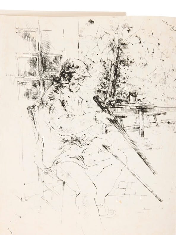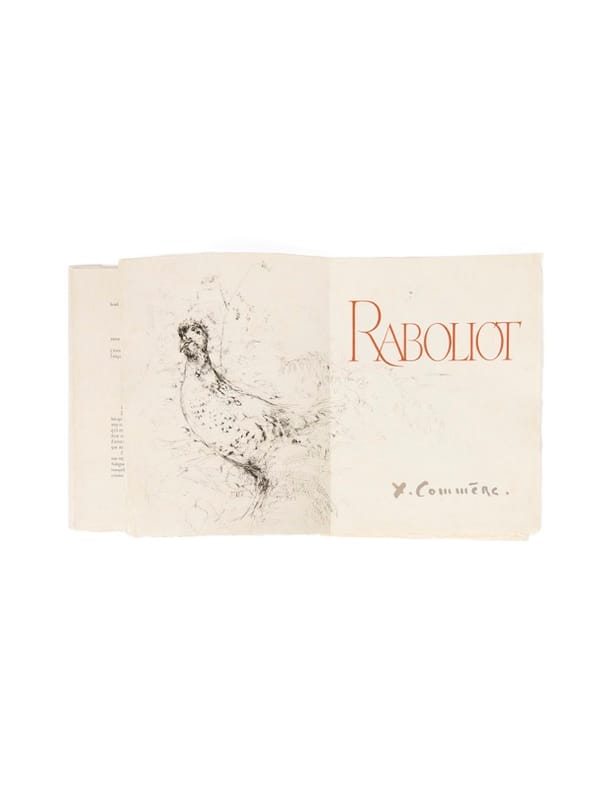 Paru dans la prestigieuse collection bibliophilique de La Belle Édition, ce Raboliot s'inscrit dans un ensemble de six titres de Maurice Genevoix sélectionnés pour leur caractère « naturaliste ». Chaque volume est confié à un illustrateur différent : Routes de l'aventure, avec des aquarelles de Pierre-Eugène Clairin ; La Boîte à pêche, avec des compositions d'André Collot ; La Dernière harde, avec des compositions et gravure à l'eau-forte en frontispice par Odette Denis ; Rémi des Rauches, avec des aquarelles de Jacques Thévenet et Rroû avec des illustrations de A. D. Steinlen, - et ce Raboliot, confié aux compositions sensibles de Paul Jarach. L'exemplaire ici présenté fut imprimé spécialement pour Sylvie Genevoix et conservé aux Vernelles, la maison familiale solognote acquise par Maurice Genevoix après le succès de Raboliot. Sylvie Genevoix y est née, y a grandi, et y a vu naître son propre rapport à la nature et à l'écriture. Elle évoquera cette maison dans une préface lumineuse à La maison de mon père : « C'est dans son havre des «Vernelles», sur un coteau dominant la Loire, que l'essentiel de l'écriture et de la vie de Maurice Genevoix s'est écoulé, à l'image du fleuve qu'il contemplait depuis son bureau. C'est dans ce nid des Vernelles que je suis née, que j'ai fait mes premiers pas, la main dans la main de mon père, là qu'il m'a appris à parler, à regarder et à m'émerveiller. [...] Je me sens, à l'égard de mon père et de cette maison à son image, redevable de tant d'indicibles trésors, de tant de ces menus riens qui enchantent ou apaisent, que je ne peux être qu'un modeste porte-parole, un témoin fidèle et attentif qui tente de transmettre et de faire partager un peu de ce qu'il a reçu. » De la bibliothèque des « Vernelles » (ex-libris).