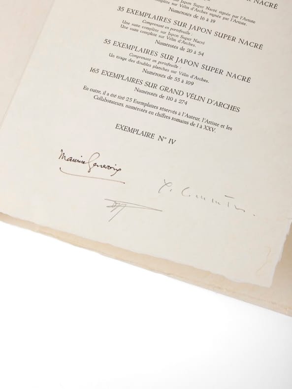 Illustrations de Jean Commère. Tirage sur japon nacré Robert Léger éditeur, (25 octobre) 1974. 1 vol. (300 x 385 mm) de 323 p. et [3] f. En feuilles, sous couverture titrée et emboîtage éditeur. Édition illustrée par Jean Commère de 20 cuivres originaux, gravés à l'eau-forte. Un des 25 exemplaires hors-commerce, signés par l'auteur, l'artiste et l'éditeur, celui-ci sur japon nacré (n° IV).