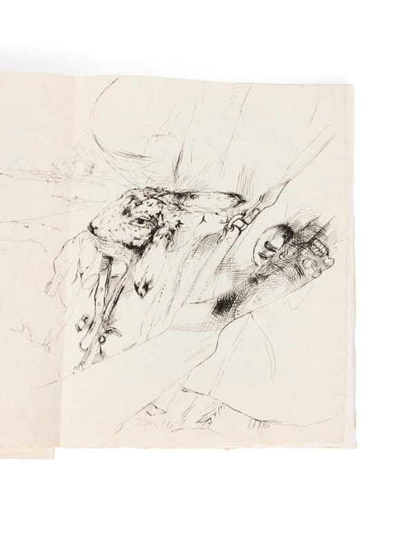 Le complément de Raboliot. Tirage unique à 41 exemplaires. Liège, Pierre Aelberts, (septembre) 1977. 1 vol. (195 x 280 mm) de 25 p. et 2 f. En feuilles, sous couverture illustrée. Édition originale. Illustrée d'un bois gravé de Dirk Valkenburg (1675- 1721). Tirage unique à 41 exemplaires. Un des 30 exemplaires sur vélin gris (n° 22).