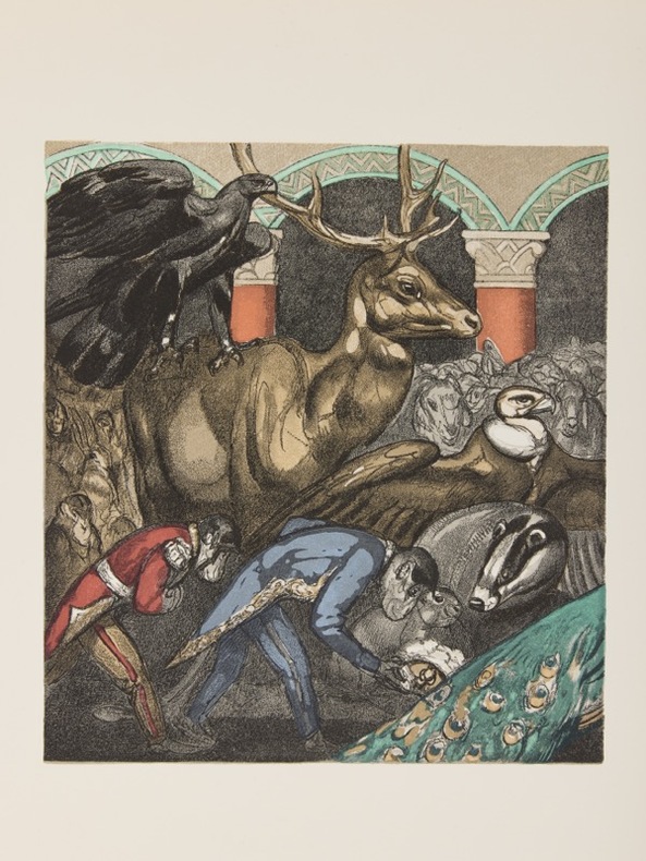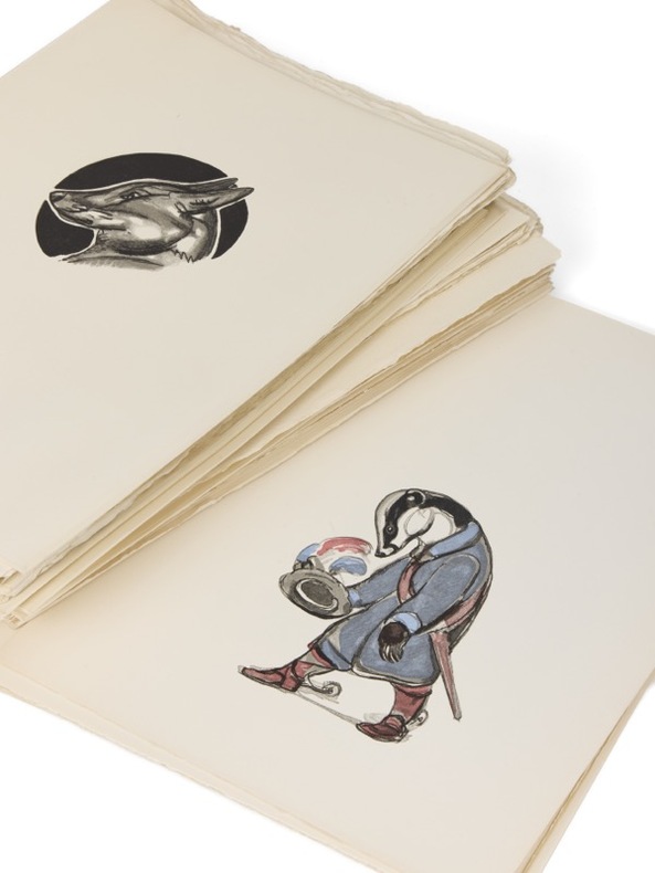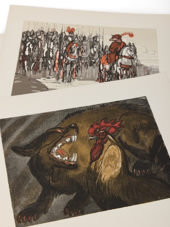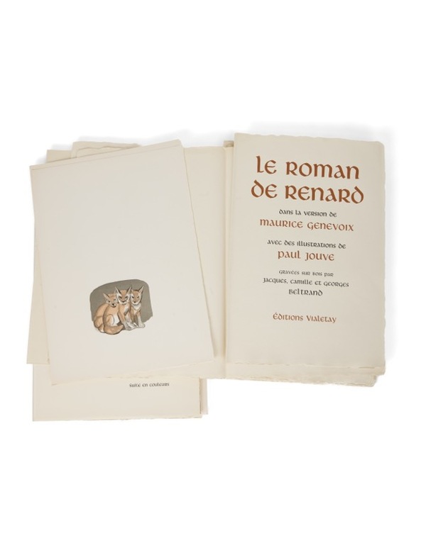 De ces exemplaires réservés aux collaborateurs, nous connaissons celui de Paul Jouve, relié par Georges Cretté, pour le collectionneur Francis Kettaneh, qui l'a acquis auprès de l'artiste en 1962. Ce précieux exemplaire, enrichi des dessins originaux, est passé en vente en 2009 chez Christie's (27 novembre 2009, n° 141) et n'est plus réapparu depuis. Notre exemplaire est donc probablement destiné à Jacques Beltrand, conservé par Maurice Genevoix, qui l'a détenu depuis lors dans sa bibliothèque de la maison des Vernelles, dans le Loiret. Il est enrichi de la suite en noir, de la suite en couleurs et de la suite de décomposition des planches doubles ; il est signé par Genevoix, Jouve et Beltrand. L'édition du Roman de Renard illustrée par Paul Jouve et adaptée par Maurice Genevoix constitue une oeuvre à la croisée de la tradition littéraire médiévale, de l'art animalier moderne et du grand livre illustré bibliophilique français du XXe siècle. Genevoix, écrivain de la nature et des êtres vivants, a toujours porté un regard empathique et poétique sur le monde animal, comme en témoignent Raboliot, La Dernière harde ou L'Hirondelle qui fit le printemps. Le choix de revisiter Le Roman de Renart - chef-d'oeuvre de la satire médiévale - s'inscrit dans cette continuité : Renart, rusé, libre et irrévérencieux, incarne une figure de résistance à l'ordre imposé, que Genevoix admire. Le texte est adapté en français moderne, comme un prélude à La Forêt perdue qui sera publiée dix ans plus tard et qui aura également pour scène le Moyen Âge : ce roman initiatique constitue un ouvrage-clé de son oeuvre, où la mort apparaît comme un thème de plus en plus présent. Il s'en est expliqué peu de temps avant sa mort, évoquant l'expérience de la mort durant la Première Guerre mondiale : « J'ai eu l'instinct de la chasse, très fort, très vif [...], mais je sais depuis [...] que l'ombre de la mort dans l'oeil d'une perdrix tuée, c'est exactement la même chose ». Le choix de Paul Jouve comme illustrateur n'est pas un hasard mais une évidence esthétique et morale : le peintre est alors le plus grand artiste animalier de son temps, connu pour ses représentations vibrantes de fauves, singes, chevaux. Il livre ici une riche illustration de 53 compositions en couleurs gravées sur bois par Jacques, Camille et Georges Beltrand, et de 33 grandes initiales gravées sur bois, fruit d'un travail de plus de dix ans, entrepris dès 1941 et alors qu'il n'a aucun éditeur pour le suivre dans ce monumental projet. Ce sont le bibliophile Jules Exbrayat et l'éditeur Jacques Vialetay qui seront à l'origine de cette édition et de sa commercialisation, et qui feront appel à Maurice Genevoix pour l'établissement du texte. Jules Exbrayat, président de la Société des Bibliophiles franco-suisses, n'aura malheureusement pas le bonheur de voir l'édition réalisée : il décède en 1958, quelques semaines avant l'impression du livre, qui lui sera dédié. Ce sera l'un des derniers ouvrages de Paul Jouve et l'un de ses chefs-d'oeuvre. De la bibliothèque de Maurice Genevoix, aux « Vernelles » (ex-libris).