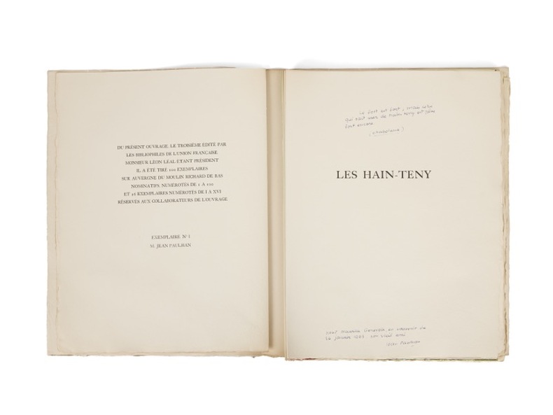 Exemplaire n° 1, pour Paulhan, offert à Maurice Genevoix. Paris, Les Bibliophiles de l'Union française, (31 octobre) 1956. 1 vol. de (340 x 445 mm) de [84] p. En feuilles, sous chemise et étui éditeur. Édition illustrée de 10 eaux-fortes originales d’André Masson. Tirage limité à 116 exemplaires numérotés sur Auvergne du Moulin Richard de Bas, (dont 100 nominatifs, et XVI réservés aux collaborateurs), signés de l’auteur, de l’illustrateur et de Léon Léal, président de la Société des bibliophiles de l’Union française. Exemplaire numéro I, nominatif pour Jean Paulhan. Envoi signé : « Le fort est fort ; mais celui qui sait user de hain-teny est plus fort encore (ohabolana). Pour Maurice Genevoix, en souvenir du 24 janvier 1963, son vieil ami. Jean Paulhan ».