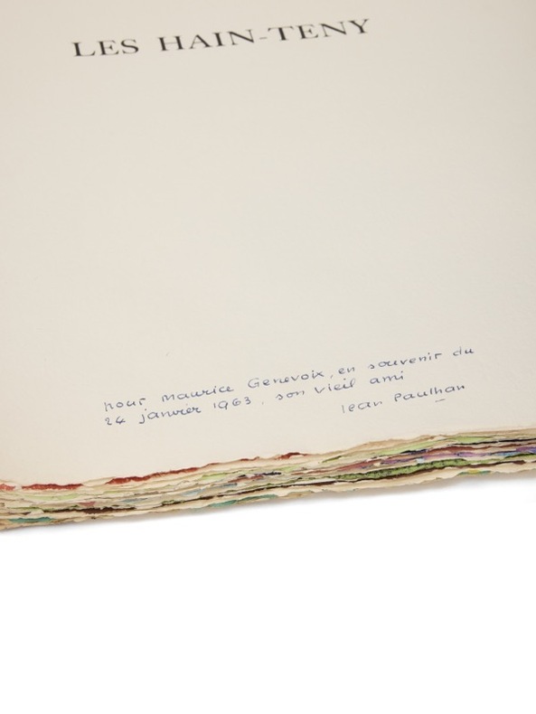 Trois années passées à Madagascar ont amené Jean Paulhan à recueillir des centaines de proverbes malgaches, à les classer, à les mettre en fiches, à les traduire : ce sont les hain-teny. Genre littéraire issu de la tradition orale de Madagascar à partir d'une poésie populaire énigmatique et souvent érotique utilisée pendant des joutes verbales amicales, ils avaient aussi une fonction sociale de résolution des conflits. Paulhan en donne connaissance pour la première fois en 1912, avec un article « Les hain-teny merinas » publié dans le Journal asiatique (t. XIX, janvier-février 1912, p. 133-162) et en donnera deux éditions majeures, l'une chez l'éditeur orientaliste Paul Geuthner en 1913, l'autre chez Gaston Gallimard en 1938-1939. L'introduction de 1939 est reprise ici pour cette édition illustrée, dans laquelle il précise la définition de ses Hain-Teny : « C'est un amour singulier, dont traitent les Hain-Teny : qui n'est pas l'amour sensuel et contemplatif de la poésie arabe, ni la passion romantique ou le simple caprice. Plutôt ferait-il songer aux joutes de l'amour courtois. C'est un amour disputeur et méticuleux, qui évoque à tout instant quelque querelle avec le proverbe qui vient la dénouer ». Comme généralement chez Paulhan, il fait précéder sa dédicace d'une maxime ; ici un ohabolana (proverbe, en malgache). Si Paulhan avait rendu compte de Raboliot, prix Goncourt 1925, dans La Nouvelle Revue française (t. XXVI, n° 148, 1er janvier 1926, p. 121-122), les lettres que Maurice Genevoix lui a adressées ne sont attestées que depuis 1960. Et c'est probablement par l'Académie française que leur amitié se renforce voire se crée. Genevoix y entre en 1946 ; Paulhan en 1963. La dédicace fait expressément référence à ce moment, puisque le 24 janvier 1963 est la date de son élection sous la coupole, au fauteuil de Pierre Benoit. C'est Maurice Garçon qui le reçut, le 27 février 1964. À l'Académie française, entre autres travaux, Jean Paulhan fournira l'article « Jules Renard » pour la publication Gloires de la France par les quarante membres de l'Académie française (Paris, Librairie académique Perrin, 1964), avec un avant-propos de Genevoix, qui, depuis 1958, assume la charge de secrétaire perpétuel. Il l'endossera pendant quinze ans, jusqu'en 1973. Que Paulhan offre à Genevoix son exemplaire nominatif et n° I ne peut pas être un acte désintéressé, et constitue une vraie marque d'hommage qui relie plusieurs mondes, ailleurs apparemment éloignés, sinon incompatibles. On peut y voir le croisement des racines des années de formation - qu'elles soient de la terre malgache et de celles de la Nièvre -, celui des réflexions sur le langage, si cher aux deux écrivains, et le respect dû à l'institution académique, pour deux hommes d'une même génération (Paulhan est né en 1884, Genevoix en 1890) ayant connu les deux guerres mondiales et ayant combattu sur le front de la première, l'un sergent du 9e Zouaves, blessé en décembre 1914, l'autre, lieutenant au 106e régiment d'infanterie, blessé en 1915. Presque cinquante ans après leur première collecte, ces « poèmes à charpente de proverbes » reparaissent au côté des images d'André Masson, qui pour eux s'était d'abord exercé aux crayons de couleur. Jean Paulhan les aime et reconnaît du cran à leur auteur. « [Je suis] touché et ravi que mes gravures polychromes pour les H.T. vous aient plu. Mais ce cran que vous voulez bien m'accorder, je dois dire qu'il me semble venir beaucoup des nécessités du procédé - des exigences du matériau. Je finirai par croire que la matière, souvent, se sert du peintre, comme l'arc se sert du tireur selon la doctrine zen », lui répond le peintre, dans une lettre du 16 janvier 1957. Masson, par ailleurs, aura peint de façon unique la chemise et l'étui des 116 exemplaires édités, renforçant ainsi la singularité propre de chacun. Un travail et une oeuvre de peintre salués par Paulhan, lequel n'aura jamais été avare de louanges : « le plus grand peintre français », écrit-il à divers correspondants. Pour l'histoire de cet ouvrage, voir les nombreuses lettres de Félia et Léon Léal à Jean Paulhan ; Berne-Joffroy, Jean Paulhan à travers ses peintres, 1974, n° 426 ; Chapon, Le Peintre et le Livre, p. 165 ; Levaillant, André Masson, Royaumont, 1985, p. 18 ; Masson-Giraud-Badin, 67 ; Monod, 8907 ; Saphire-Cramer, n° 36 ; Bakoly Domenichini-Ramiaramanana, Du ohabolana au Hainteny, 1983 ; Bernard Baillaud, Les Écrits de Jean Paulhan, Bibliographie, Société des lecteurs de Jean Paulhan, 2025, p. 414. Nous remercions Bernard Baillaud pour l'éclairage et l'aide bibliographique, éléments précieux à la rédaction de cette notice.