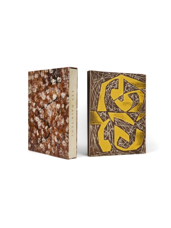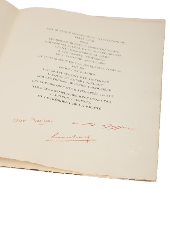 Les Bibliophiles de l’Union Française, Paris 1956. 1 volume in-folio en feuilles sous couverture illustrée de 2 gravures à pleine-page, chemise-étui décoré de l'éditeur. Edition originale illustrée de 18 EAUX-FORTES ORIGINALES EN COULEURS ET RELIEFS dont 10 à peine-page et 10 ornant les titres des poèmes. Tirage : 116 exemplaires, tous sur Auvergne du Moulin Richard de Bas, numérotés et nominatifs signés au crayon brun par l'éditeur, l'auteur et l'artiste. Troisième ouvrage édité par les Bibliophiles de l'Union Française. Poésies/proverbes populaires Malgaches "Les hain-teny ont leur secret, ce sont des poèmes doubles, dont le sens caché, et le seul efficace, relève d'une logique proverbiale, stricte et sévère (…) Quant au sens apparent, il traite d'amour. Jean Paulhan (1884-1968) vécut à Madagascar de janvier 1908 à novembre 1910. Il y occupa les fonctions de professeur de lettres au collège de Tananarive. Ses thèmes d’étude ne seront ni ceux des fonctionnaires ni ceux des missionnaires. Jean Paulhan aima la Grande Ile où le brouillard « marche lentement », le peuple dont il recueillit et traduisit les hain-teny. Trop secret ou impénétrable pour notre culture occidentale ? Le fait étrange est que contrairement au pantoum malais, ou au haïku japonais, le mot hain-teny n'est pas aujourd'hui retenu dans les dictionnaires de langue française…