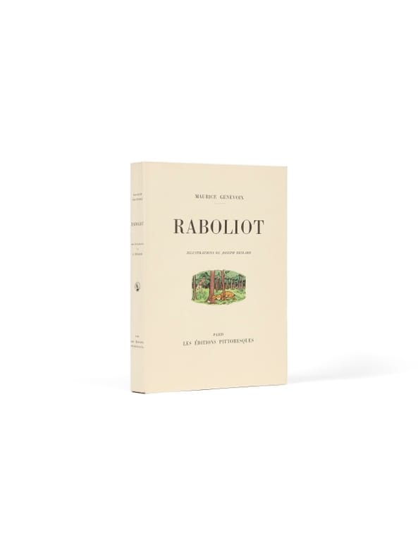 Paru dans la prestigieuse collection bibliophilique de La Belle Édition, ce Raboliot s'inscrit dans un ensemble de six titres de Maurice Genevoix sélectionnés pour leur caractère « naturaliste ». Chaque volume est confié à un illustrateur différent : Routes de l'aventure, avec des aquarelles de Pierre-Eugène Clairin ; La Boîte à pêche, avec des compositions d'André Collot ; La Dernière harde, avec des compositions et gravure à l'eau-forte en frontispice par Odette Denis ; Rémi des Rauches, avec des aquarelles de Jacques Thévenet et Rroû avec des illustrations de A. D. Steinlen, - et ce Raboliot, confié aux compositions sensibles de Paul Jarach. L'exemplaire ici présenté fut imprimé spécialement pour Sylvie Genevoix et conservé aux Vernelles, la maison familiale solognote acquise par Maurice Genevoix après le succès de Raboliot. Sylvie Genevoix y est née, y a grandi, et y a vu naître son propre rapport à la nature et à l'écriture. Elle évoquera cette maison dans une préface lumineuse à La maison de mon père : « C'est dans son havre des «Vernelles», sur un coteau dominant la Loire, que l'essentiel de l'écriture et de la vie de Maurice Genevoix s'est écoulé, à l'image du fleuve qu'il contemplait depuis son bureau. C'est dans ce nid des Vernelles que je suis née, que j'ai fait mes premiers pas, la main dans la main de mon père, là qu'il m'a appris à parler, à regarder et à m'émerveiller. [...] Je me sens, à l'égard de mon père et de cette maison à son image, redevable de tant d'indicibles trésors, de tant de ces menus riens qui enchantent ou apaisent, que je ne peux être qu'un modeste porte-parole, un témoin fidèle et attentif qui tente de transmettre et de faire partager un peu de ce qu'il a reçu. » De la bibliothèque des « Vernelles » (ex-libris).
