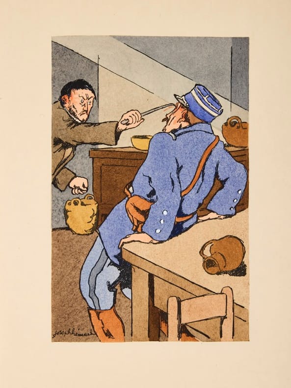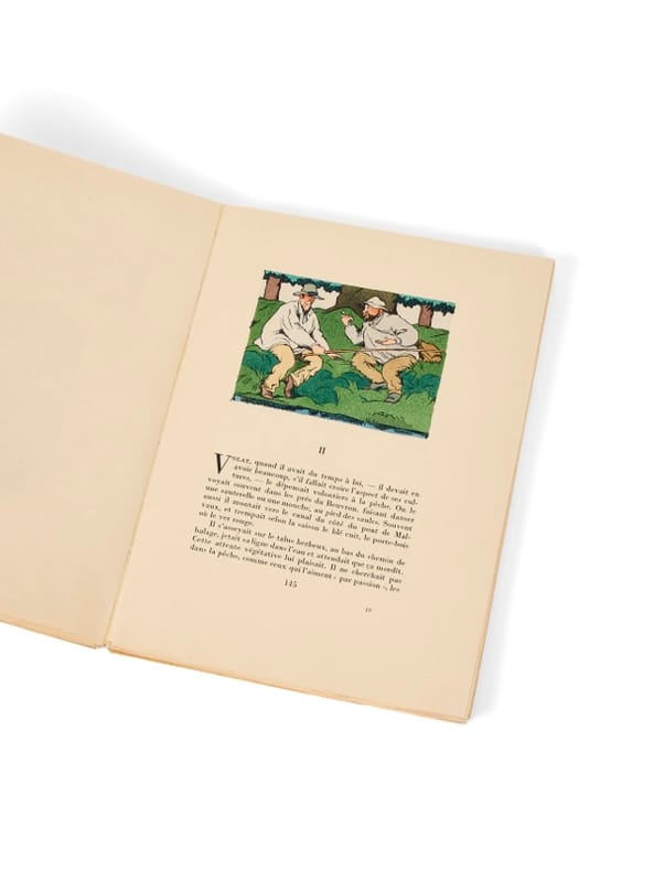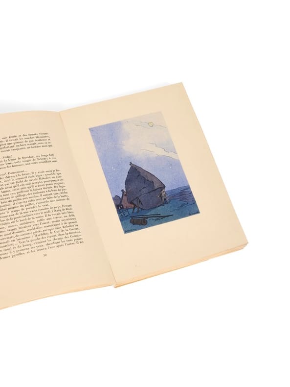 Quatrième édition illustrée de Raboliot, et l'une des plus réussies, tant pour la qualité de l'impression que pour la verve graphique de Joseph Hémard, maître de la caricature et de l'illustration en couleurs. L’ouvrage est illustré de 33 planches hors texte en couleurs, auxquelles s’ajoutent de nombreuses vignettes, bandeaux et culs-de-lampe, caractéristiques du style truculent et expressif d’Hémard. Artiste complet, Hémard (1880–1961) fut tour à tour dessinateur satirique, typographe et éditeur. Mobilisé à l’âge de 34 ans en août 1914, il rejoint le 155e régiment d’infanterie, mais est fait prisonnier en octobre de la même année. Il est interné au camp de Güstrow, en Allemagne du Nord, où il réalisera de nombreux croquis de la vie quotidienne en captivité. Rapatrié en France le 31 décembre 1918, il reprend ensuite une carrière féconde d’illustrateur, devenant l’un des artistes les plus appréciés de l’entre-deux-guerres pour ses éditions illustrées de codes juridiques, romans et œuvres classiques. Dans Raboliot, son trait malicieux épouse parfaitement l’univers paysan, rustique et libre du roman, en lui apportant une touche d’humour décalé mais respectueux. Il s’agit d’une des premières grandes éditions illustrées du roman couronné du Goncourt cinq ans plus tôt De la bibliothèque de Maurice Genevoix, aux « Vernelles » (ex-libris).