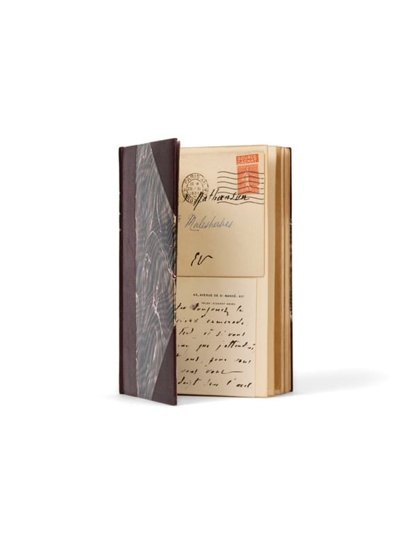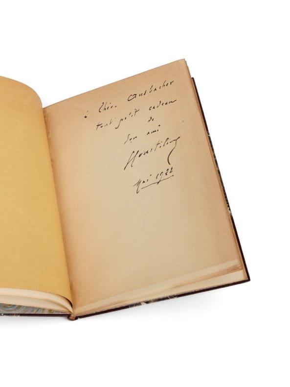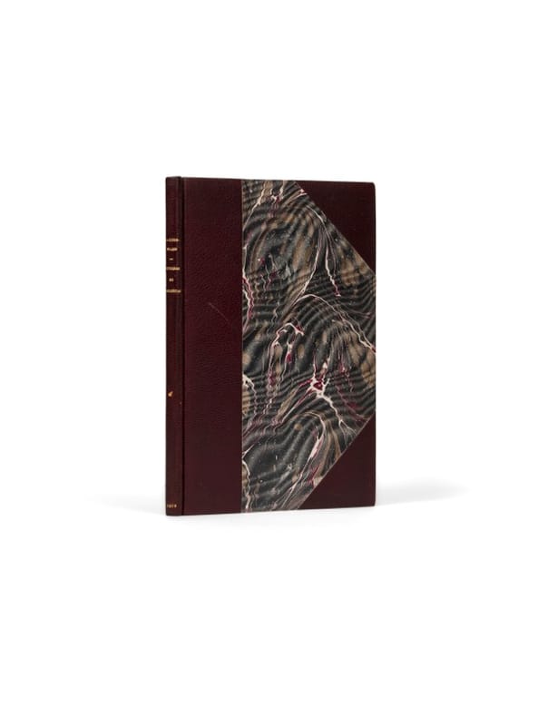 Un des 10 exemplaires de tête avec envoi. Paris, Stock, 1902. 1 vol. (135 x 190 mm) de [1] f., 28 p. et 1 f. Demi-chagrin aubergine à coins, dos lisse, titre doré, date en pied, tête dorée, couvertures et dos conservés (reliure signée de C. Dreneau). Édition originale. Un des 10 premiers exemplaires sur hollande justifiés et signés par l'éditeur P.-V. Stock, (n° 2). Envoi signé: «à Théo.[dore] Ansbacher, tout petit cadeau de son ami, G. Courteline, mai 1922». Montée en tête : une carte autographe signée (115 x 90 mm) avec l'enveloppe conservée.
