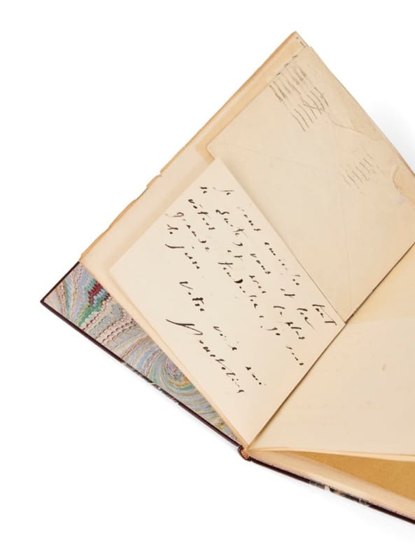 Charmant exemplaire adressé au banquier Théodore Ansbacher, dit 'Théo', ami des écrivains et artistes de son temps. L'exemplaire est enrichi d'une carte signée à Louis-Alfred Nathanson (avec enveloppe conservée): «Vous êtes toujours le même délicieux camarade [...] et si vous vous imaginez que j'attendrai, moi, vingt ans pour vous embrassez vous vous mettez le doigt dans l'oeil...» Ami de longue date de Courteline, Jules Renard et Tristan Bernard, Alfred Nathanson fut auprès de Blum de l'équipe de rédaction de L'Humanité. Petit accroc au dos.