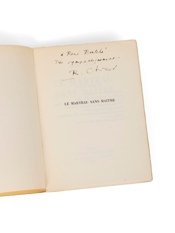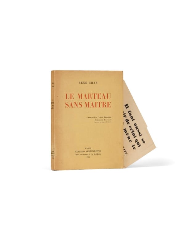 Longtemps perçu comme un recueil fondateur de la période surréaliste de René Char, Le Marteau sans maître occupe une place plus complexe : Char s’est toujours défendu d’appartenir véritablement au mouvement, dont il ne fut qu’un « passager locataire ». Mais ce livre, publié au cœur des années 1930, marque bien une césure dans la poésie française de l’entre-deux-guerres, où l’éclat des fulgurances se conjugue à une rigueur presque ascétique. « C’est une révolte que j’ai vécue seul sans communiquer », confiera-t-il plus tard à Paul Veyne. Le titre est choisi dès 1933, lorsque Char soumet son manuscrit à Gaston Gallimard, qui refuse de le publier. Le poète se tourne alors vers José Corti, éditeur déjà engagé dans la diffusion de textes surréalistes. Celui-ci accepte de l’imprimer « aux Éditions surréalistes », dans une édition collective en partie originale qui réunit Arsenal, Artine, L’action de la justice est éteinte et, pour la première fois, les Poèmes militants. Pour la rédaction du prière d’insérer, Char sollicite successivement Paul Éluard et André Breton, avant de retenir finalement le texte de Tristan Tzara, qu'il remerciera par ces mot : « Je suis enchanté, avec toute la gravité, l’émerveillement que ce mot renferme, de vos lignes à l’infini. (…) Je ne vois d’aussi claire ceinture pour m’entourer nulle part, il ne faut pas mêler les diamants. Ainsi donc vous seul. Et j’en suis ravi et pour mon livre et pour le lecteur. » Le prière d'insérer est bien présent, ainsi que le bandeau éditeur à parution.