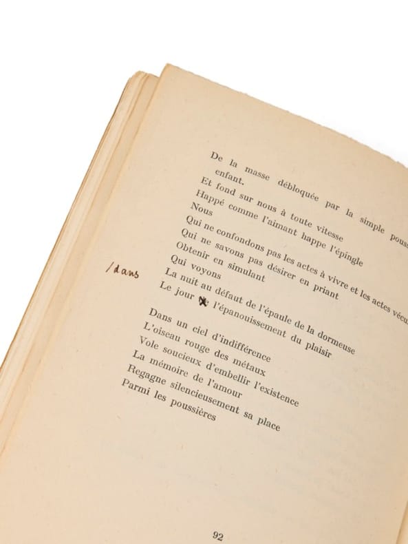 Premier livre de Char chez Corti.Exemplaire René Bertelé avec envoi. Paris, Éditions Surréalistes, (20 juillet) 1934. 1 vol. (140 x 190 mm) de 142 p. et [1] f. Broché. Édition originale. Un des 500 exemplaires du tirage ordinaire - après 20 exemplaires sur arches ornés d'une eau-forte de Kandinsky. Envoi signé : «à René Bertelé, très sympathiquement, R. Char».