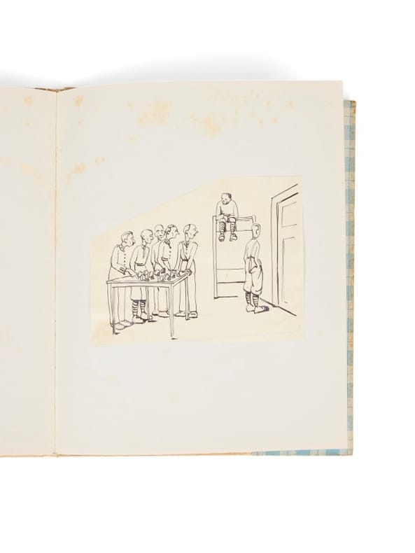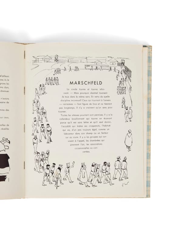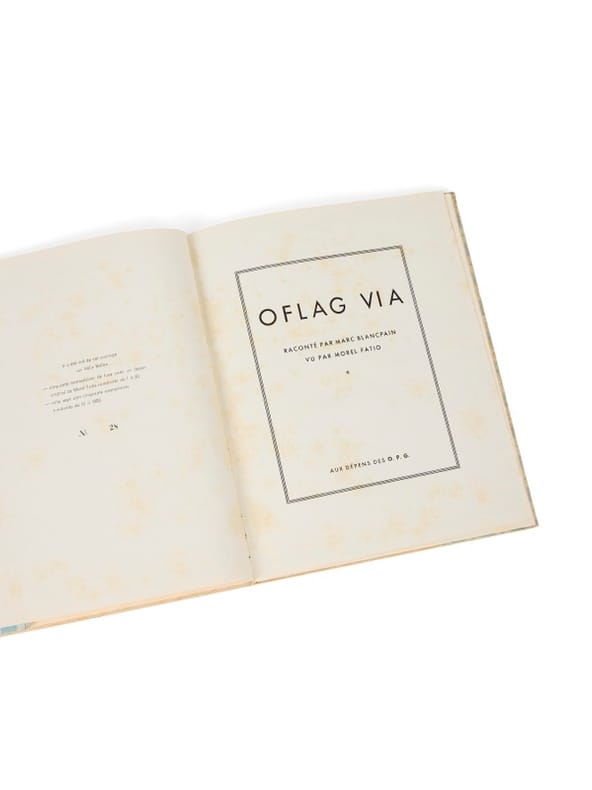 De mai à juin 1940, les combats de la Seconde Guerre Mondiale font près de 100 000 morts, et 1 900 000 prisonniers de guerre (P.G.) sont envoyés dans les oflags et les Stalags, répartis sur l'ensemble du territoire du IIIe Reich. Parmi eux, près de 36 000 officiers sont envoyés dans les oflags - abréviations de Offizierslager [camp d'officiers] - et 20 000 d'entre eux resteront en captivité jusqu'à la libération des camps par les troupes alliées en 1945. Cette publication qui décrit le quotidien de l'oflag VI A de Soest - à l'Est de Dortmund, en Westphalie - est réalisée sur place et imprimée dans la ville voisine d'Eberfeld, par Marc Blancpain : ce licencié ès lettres, normalien, professeur à Genève puis au Caire jusqu'en 1939, fut mobilisé en 1939 comme officier d'infanterie. Il est fait prisonnier en juin 1940 et restera en captivité en Allemagne jusqu'en 1943. Là-bas, il y animera le Cercle d'études de la Révolution nationale, dans un camp qui aura vu passé en captivité un certain Robert Brasillach qui, sur demande officielle de l'ambassade d'Allemagne à Paris (qui tenait depuis octobre 1940 une liste d'idéologues prêts à servir la cause nazie) sera rapidement libéré : il regagnera Paris dès mars 1941 pour reprendre son poste de rédacteur en chef de l'hebdomadaire Je suis partout. L'illustration de la première de couverture représente une vue de chambrée ; suivent plusieurs scènes de vie, dessinées par Morel Fatio décrivant les occupations rythmant la vie de cet oflag, qui comptera jusqu'à 4000 prisonniers - dont deux généraux et deux colonels de l'armée française - et sera libéré par les troupes américaines le 6 avril 1945. Le dessin de couverture est l'oeuvre d'Henri Tougard, tandis que la mise en pages de l'album a été conçue par Michel Kieffer : ce diplômé de l'école Estienne et des Arts décoratifs est le fils du relieur et éditeur René Kieffer, auprès duquel il pratique la reliure depuis 1936. Il lui succédera à la tête de la librairie à partir de 1958. Marc Blancpain sera libéré au début de l'année 1944 et rejoindra Paris et la presse écrite ; il signera l'éditorial du Parisien libéré du 25 août 1944 - le premier après la Libération de la ville - et donnera à la radio la première revue de presse libre, avant de devenir secrétaire général de l'Alliance française, qu'il présidera ensuite de 1978 à 1993. Maurice Genevoix et Marc Blancpain se retrouveront 25 plus tard, lorsqu'il siégeront tous les deux au Haut comité pour la défense et l'expansion de la langue française, créé en mars 1966 par Georges Pompidou, alors au poste de Premier ministre. Delphine Richard, « Prisonniers de guerre juifs... », Thèse, Université Lumière Lyon II, juin 202, p. 675-683.