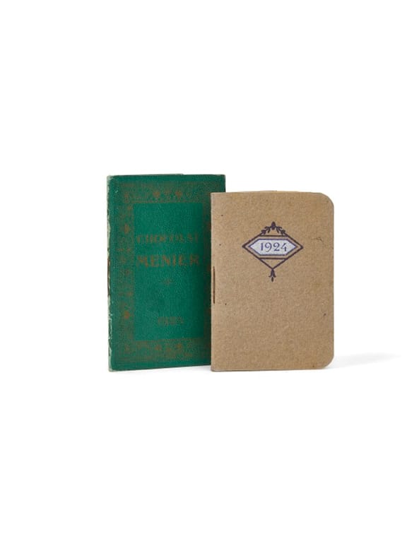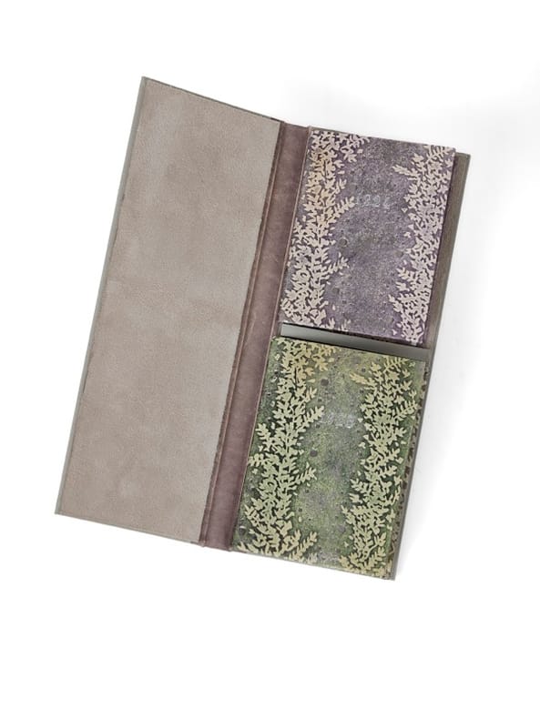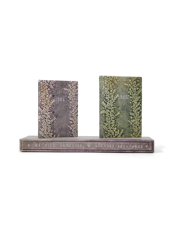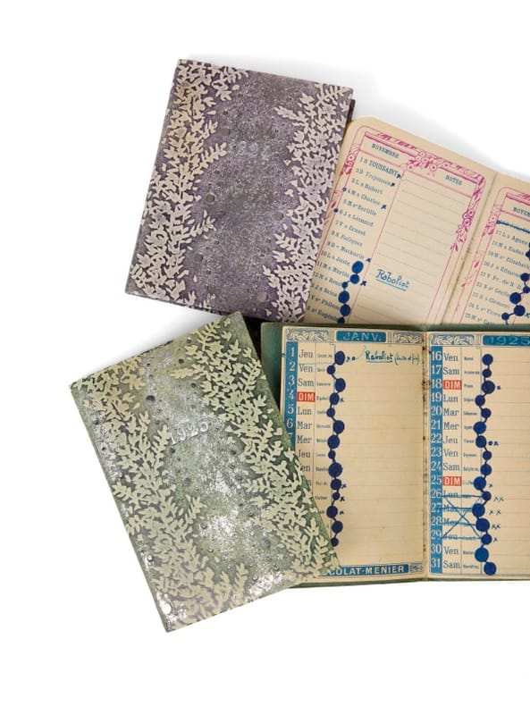 Témoignage exceptionnel du processus créatif de Genevoix [1924 et 1925]. 2 vol. (55 x 80 mm et 60 x 80 mm). Brochés, sous chemises en veau naturel estampé d’une eau-forte originale au motif de feuillages, teintée mauve pour l’une et vert pour l’autre, semis de points au palladium, gardes de chèvre velours gris, chemise et étui bordés (signée de Louise Bescond, titres Claude Ribal, 2025). Témoignage exceptionnel du processus créatif de Genevoix : deux agendas manuscrits, qui documentent jour après jour l’avancement de trois œuvres majeures : Euthymos, Raboliot et La Boîte à pêche.