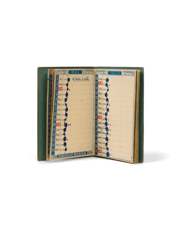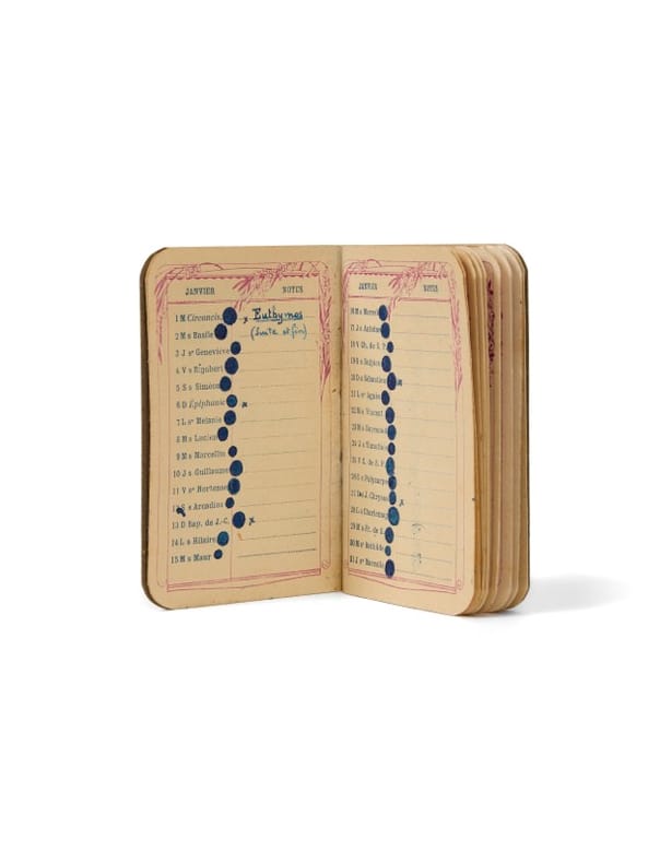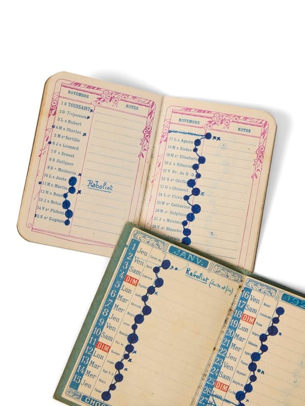 Chaque page porte, tracées à l'encre bleue, des pastilles journalières marquant le travail d'écriture, dont la taille et la densité signalent l'intensité du labeur. Ces carnets permettent ainsi de suivre l'auteur au plus près dans le temps de la création. Le premier carnet s'ouvre sur les journées d'écriture qui concernent la rédaction d'Euthymos (janvier-avril 1924), un roman antique inspiré du pugiliste éponyme, triple champion olympique. Publié chez Flammarion en juin 1924, quelques semaines avant l'ouverture des Jeux de Paris, le 5 juillet 1924. Euthymos marque une tentative certaine de s'évader du traumatisme de 14-18. Un texte pour lequel Genevoix attendra 1960 pour en permettre la réédition, sous le titre Vaincre à Olympie. Passé la rédaction d'Eutymos, Maurice Genevoix a déjà sûrement bien en tête son prochain roman. Il sera régionaliste, et il sera naturaliste. Depuis 1919, il est revenu vivre à Châteauneuf-sur-Loire qui lui avait inspiré un merveilleux Rémi des Rauches, publié en 1922, et qui mettait en scène la Loire par la grâce d'un tonnelier, offrant déjà au lecteur de magnifiques descriptions. Mais cette fois, il veut traverser le fleuve : au sud commence la Sologne, qu'il explore depuis son retour dans la région. Né à Decize (Nièvre) mais élevé à Châteauneuf-sur-Loire, Genevoix perçoit dès l'enfance la présence silencieuse de la Sologne : forêts, brumes, oiseaux, landes pauvres et villages retirés. Dès son retour du front et pour sa convalescence, dès 1919, il commence à l'arpenter et plusieurs séjours sont attestés en son coeur, à Brinon-sur-Sauldre, à Nouan-le-Fuzelier, à Lamotte-Beuvron où il s'imprègne des moeurs, des récits et du parler local. Il fait sienne l'idée d'en dire davantage : « je voulais faire pour la Sologne ce que j'avais fait trois auparavant pour le Val de Loire : l'évoquer, la traduire selon moi, mon engagement depuis l'enfance, ma gratitude pour tout ce qu'elle était à mes yeux». C'est à Brinon-sur-Sauldre qu'après la guerre son oncle avait acquis un territoire de chasse et c'est là que, cédant peut-être au même appel et même élan vers la nature, Maurice Genevoix décide de s'installer, au cours de l'été 1924 : « Je pris, un soir, mon vélo à l'épaule, le petit train sur route qui me conduirait à Brinon. J'y arriva à la brunante, sautai en selle, et mit pied à terre après six kilomètres devant la maison du garde-chasse Trémeau» (in Trente mille jours, p. 200). C'est là, face à l'étang des Clouzioux - qui devient celui de la Sauvagère dans le roman - que ses cogitations prennent formes : « la Sologne est éminemment giboyeuse. Le héros de mon futur roman, vrai fils de ce terroir de chasse, ne peut donc être qu'un chasseur [...] mais un chasseur d'instinct, un homme libre, insoucieux des contraintes sociales, qui ne relève que de sa race, des appels qui le sollicitent et l'obligent, autrement et précisément dit : un braconnier ». Brinon est la commune natale de celui qui est « le plus fameux, le plus malin, le plus habile, le plus sensationnel braco du cru : Alphonse Depardieu», dit Carré, avec lequel Genevoix obtient une « audience» à l'automne, quand la certitude du roman et le bal de ses personnages se mettent en place. Un rendez-vous est pris, à Brinon. Un rendez-vous manqué : suspicieux, le braconnier ne s'y rendra pas. Il n'empêche ; Genevoix, décidé à façonner ce braconnier universel en fusionnant plusieurs personnages, tous bien réels, va créer «son» braconnier : Pierre Fouques, dit Raboliot. Maurice Genevoix racontera précisément dans Jeux de glaces (en 1961) cette rencontre avortée avec Carré-Depardieu, lequel « n'a pas été le dernier à prétendre, à croire peut-être, qu'il m'avait servi de modèle. Et vraiment je lui dois beaucoup, à cet homme qui n'est pas venu, un jour de l'automne 1924, dans l'arrière-salle de l'auberge rustique où je l'ai vainement attendu» (p. 90). Il y explique également le sobriquet de son héros : le nom de Raboliot - désignant un jeune garenne encore au nid, dans la « rabolière » - lui vient des chasseurs solognots : vif, rusé, libre. Dans le carnet, la date du 21 octobre est précisément nommée, avec cette mention : Brinon. C'est probablement la date précise du rendez-vous manqué, éminemment fondateur. Moins de trois semaines plus tard, Genevoix peut s'attaquer à la rédaction du roman, le 10 novembre 1924, pour la terminer le 23 janvier 1925, sans interruption. De Brinon-sur-Sauldre, Genevoix aura beaucoup pris, tel un épicentre idéal : la commune est tout simplement celle du département qui occupe - encore aujourd'hui - la plus grande superficie territoriale : elle s'étend sur 11600 hectares et est sillonnée par quelque 340 km de chemins ruraux ! En 2025, seules 132 communes en France occupent plus de 100 km2 de superficie. À la suite de Raboliot, c'est la rédaction de La Boîte à pêche qui débute, s'étendant du 1er mai au 15 juillet 1925. L'ouvrage paraîtra, toujours chez Grasset, en octobre 1926. Merveilleux et unique document, révélateur du rapport de Genevoix au temps : un travail on ne peut plus régulier, écrit d'un seul souffle, dans une concentration totale. Ce système, qu'il ne commente jamais mais applique avec constance, dit beaucoup de la rigueur intérieure de l'écrivain et de son attachement à un rythme quotidien, presque rituel. Ces deux carnets sont conservés dans un ' habillage ' intelligemment et délicieusement pensé et réalisé par Louise Bescond : deux petites chemises au décor verdoyant, rappelant à la fois l'univers du roman et le rythme de sa composition dans ces deux petits agendas. L'ensemble est conservé dans un étui et des chemises à l'unisson.