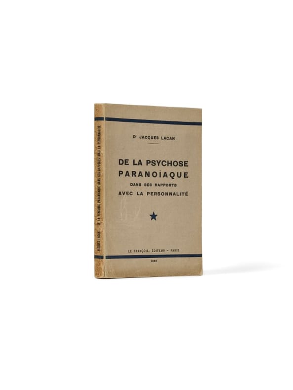 Very rare first edition, presentation-copy with an exceptional provenance, of Lacan's groundbreaking doctoral thesis, which constitutes the foundation of all his later work and inaugurated a new era in psychology and psychiatry. The copy is inscribed and signed by Jacques Lacan to professor Hesnard - highly important fellow psychiatrist famous for introducing Freud in France - in November 1932 (""à monsieur le professeur Hesnard en signe de ma respectueuse sympathie, Jacques Lacan, Ce 26 novembre 1932""). Furthermore, the copy has been in the possession of the important psychoanalyst and historian Alain de Mijolla (1933-2019) and bears his extensive notes and underlinings. Lacan, who is often referred to as ""the most controversial psycho-analyst since Freud"", ""the father of French psychoanalytical thinking"", and a towering intellectual giant of the twentieth century, plays as dominant a role in modern psychology and the development of psychological thought as Freud. It is his doctoral dissertation (the present work) that constitutes the inaugural moment in his work. ""Lacan's theoretical engagement with psychosis constitutes a central platform for his ventures into psychoanalysis"" from his doctoral thesis on paranoia in the 1930s through to his seminar on Joyce in the 1970s, the question concerning the psychoanalytic treatment of psychosis was at the forefront of his clinical work."" Aimée, Lacan's patient and subject of his thesis, bears the same importance for the history of psychology as Anna O., the patient in Freud and Breuer's ""Stydies of Hysteria"". Aimée was a thirty-eight-year-old woman, who had tried to stab the celebrated actress Huguette Duflos and was thus imprisoned, in April 1931. The story immediately reached the press, and ""Aimée"" (Lacan's pseudonym for her) became famous in the whole country. Lacan began to see her one month later at the Sainte-Anne Hospital. Through biographical inquiry, Lacan established a classic picture of her and noticed a development that would come to play a central role in his psychological theory: after three weeks of incarceration, Aimée was almost completely out of her delusional state, which Lacan considered evidence of the acute nature of her paranoia. This connection, which according to Lacan meant that she found consolation only in her punishment, not in the act itself, caused Lacan to propose a new diagnostic category, namely ""self-punishment paranoia."" ""It [i.e. ""De la Psychose Paranoïaque""] took on the importance that had previously been accorded to studies in hysteria in the rise of the international movement. Just as Freud had given hysteria its patents of nobility in endowing it with full-fledged existence as an illness, so Lacan, forty years later, gave paranoia, and more generally psychosis, an analogous place within the French movement"" (E. Roudinesco: La Bataille de cent ans, l'histoire de la psychanalyse en France, Vol. 2, p. 114). With Lacan's doctoral dissertation, Aimée quickly became a cause celebre for the surrealists. In the ""De la Psychose Paranoïaque"", Lacan also included a selection of Aimee's copious writings, which were produced at the height of her psychosis. This also contributed to the immediate importance of the work and to the spreading of Lacan's novel theories. ""Certainly it was this feature which was seized upon by its first surrealist readers, and which gave to this medical thesis right from the start a position in contemporary, even avant-garde thinking, which was markedly different from the usual dustgathering oblivion that is the fate of such work."" (Olga Cox-Cameron: Lacan's Doctoral Thesis: Turbulent Preface or Founding Legend?) ""Jacques Lacan is regarded as the father of French psychoanalytical thinking. He trained in mainstream psychiatry and his doctorate thesis was supervised by Gaétan de Clérambault. After the Second World War he became a cult figure in French intellectual circles, mixing Freudian ideas with social comment. As with many French intellectuals, he founded an ephemeral one-man movement with many followers"" (Preface to the English translation (1986)). ""Jacques Lacan (April 13, 1901 to September 9, 1981) was a major figure in Parisian intellectual life for much of the twentieth century. Sometimes referred to as ""the French Freud,"" he is an important figure in the history of psychoanalysis. His teachings and writings explore the significance of Freud's discovery of the unconscious both within the theory and practice of analysis itself as well as in connection with a wide range of other disciplines. Particularly for those interested in the philosophical dimensions of Freudian thought, Lacan's oeuvre is invaluable. Over the course of the past fifty-plus years, Lacanian ideas have become central to the various receptions of things psychoanalytic in Continental philosophical circles especially."" (SEP). Provenance: Angelo Louis Marie Hesnard (1886-1969) was an extremely important early French psychonanalyst and psychiatrist famous for his contributions to French sexology in the 30'ies and his groundbreaking early studies on Freud. He was a founding member of the Société psychanalytique de Paris, founded in 1926, and he occupies a central role in the history of modern psychoanalysis, being the co-author of the first French work on psychoanalysis and the person who introduced Freudian psychoanalysis to France. In the fifties he debated with Jacques Lacan over the meaning of Freud's saying ""Where It was, shall I be"""" but when debarred by the IPA from the roster of training analysts as a representative of the chauvinist wing of French psychoanalysis, he followed Lacan into the École Freudienne de Paris in 1964. ""HESNARD, ANGÉLO LOUIS MARIE (1886-1969)A psychoanalyst, doctor with the French Navy, and professor at the École Principale du Service de Santé de la Marine... He was coauthor of the first French work on psychoanalysis and one of the founding memb