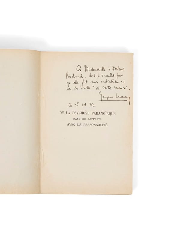 Précoce et précieux exemplaire de la thèse, offert dès le 25 octobre 1932, à Marguerite Badonnel, alors chef de clinique à Sainte-Anne ; elle avait eu le jeune Jacques Lacan comme interne un an plus tôt. Lacan avait dédicacé le premier exemplaire reçu à ses parents, dès le 23 octobre. Deux autres dédicaces suivront, à des confères, le lendemain. Puis, le 25 octobre, à nouveau deux, dont celui-ci - le premier à une femme. La riche carrière de médecin psychiatre de cette dernière avait débuté plus de dix ans plus tôt : après une année comme interne suppléante dans le service du professeur Henri Claude à Sainte-Anne de novembre 1919 à décembre 1920, Marguerite Badonnel est reçue au concours 1920 de l'internat en médecine des asiles de la Seine. Sa thèse de doctorat est soutenue en juin 1924 et lui vaut le titre de lauréat de la faculté. Elle est intitulée Contribution à l'étude des troubles des fonctions organiques dans la Mélancolie. Elle rejoint à nouveau Sainte-Anne et devient, à partir de novembre 1924, chef de clinique adjoint à la Clinique des maladies mentales que dirige toujours Henri Claude, avant d'être détachée, après concours, comme chef de clinique titulaire de neuro-psychiatrie infantile dans le service de Georges Heuyer : c'est la première à occuper cette fonction, et elle est, à 30 ans, la plus jeune chef de clinique en psychiatrie de France. Claire Vogt-Popp - à qui Lacan offrira sa thèse le 25 novembre - lui succédera à ce poste en 1929, quand Badonnel intègre le Centre de psychiatrie Henri-Rousselle : c'est alors l'établissement le plus avancé de la recherche psychiatrique. Installé dans l'enceinte de Sainte-Anne, il comprend un dispensaire, un service social, une consultation pour enfants, deux laboratoires de recherche clinique et de psychologie et un « service départemental de prophylaxie mentale ». L'établissement sera, en avril 1941, définitivement rattacher à l'asile clinique Sainte-Anne Jacques Lacan à quant à lui réussit le concours qui lui permet de commencer en 1927 son internat dans le service « Clinique des maladies mentales et de l'encéphale » que dirige Henri Claude ; il poursuit ensuite, à partir de 1931, son internat à l'hôpital qu'Henri Rousselle : il a alors Marguerite Badonnel comme chef de clinique. C'est là-bas qu'il obtient un diplôme de médecin légiste et surtout qu'il peut faire l'observation de la genèse de la paranoïa et du développement du délire chez ses propres prises en charge. La dédicace de Lacan fait directement référence à cette période si importante pour lui, la désignant comme “ l'initiatrice en un des « cercles» de notre science”. C'est au cours de cette année-là qu'il rencontre pour la première fois, à l'hôpital Sainte-Anne, le 18 juin 1931, Marguerite Anzieu, née Pantaine (1892-1981) : hospitalisée pour avoir tenté de poignarder une actrice, Huguette Duflos, au motif que celle-ci menaçait de mort son jeune fils Didier, la patiente retient toute l'attention de Lacan, « qui fit d'elle un cas d'érotomanie et de paranoïa d'autopunition. Entre le psychiatre et Marguerite, il n'y eut jamais la moindre entente. Elle ne cherchait nullement à être soignée ou prise en charge, et il ne chercha pas à la convaincre de se regarder comme une patiente. Car il ne s'intéressait à cette femme que pour illustrer sa doctrine de la paranoïa» (Élisabeth Roudinesco, Lacan, envers et contre tout, 2011). Un an plus tard, à partir de l'étude de cas, son travail de doctorant est achevé, consacré à La psychose paranoïaque dans ses rapports avec la personnalité. Jacques Lacan « [...] la soutient en 1932 devant un jury présidé par Henri Claude. Dans cette thèse, il n'hésite pas à proposer une rénovation de la psychiatrie : il s'agit d'une rénovation partielle, fondée sur la psychanalyse, mais qui l'amène à introduire la psychose dans le champ de la psychanalyse, par le biais de la paranoia, et non par celui de la schizophrénie comme le faisait Jung. La these est publiée chez Le François à Paris [...]. La publication sera remarquée par Paul Nizan dans L'Humanité, par René Crevel dans Le Surréalisme au service de la révolution, par Salvador Dali dans Le Minotaure, et par Jean Bernier dans La Critique sociale (revue marxiste fondée par Boris Souvarine) » (Jacques Sédat). Lacan obtiendra également le prix Jules Baillarger - du nom d'un aliéniste du XIXe - de l'Académie nationale de médecine, annoncé le 13 mars 1934 et décerné à Lacan le 11 décembre. L'édition chez Le François de la thèse existe sous deux formes, presque identiques et avec un achevé d'imprimer commun du 1er octobre 1932 : l'ensemble de l'édition est imprimé avant la soutenance, qui aura lieu au début du mois de novembre, avec Henri Claude comme président du jury. Lacan est alors l'amant de Marie-Thérèse de Bergerot, de quinze ans son aînée, puis d'Olesia Sienkiewicz, deuxième femme de son futur ami Pierre Drieu la Rochelle. La première va dactylographier la thèse, la seconde en financera l'impression, chez l'éditeur scientifique Le François. Sitôt imprimée, et une quinzaine de jours avant sa soutenance, Jacques Lacan va offrir quelques exemplaires de sa thèse ; d'abord à ses parents, puis à ses ses consoeurs et confrères du “ premier cercel”, et jusqu'en 1933. Il sera, en novembre, nommé par arrêté préfectoral, « Chef de clinique titulaire de la clinique de neuropsychiatrie infantile de l'Asile clinique de l'hôpital Sainte-Anne» : sans que l'on sache si c'est une demande de sa part, ou une modification souhaitée par son éditeur Le François, il est décidé d'ajouter cette nomination dans la publication : les couvertures et les pages de titres sont ainsi modifiées avec l'ajout, sous son nom, de la mention « chef de clinique à la Faculté de Médecine de Paris ». Cette modification intervient probablement en début 