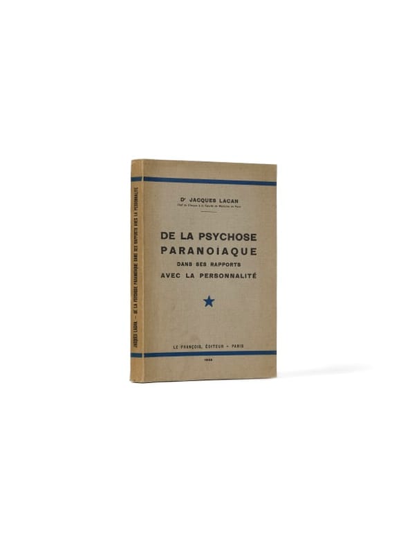 Le 18 juin 1931, à l'hôpital Sainte-Anne, Lacan rencontre pour la première fois Marguerite Anzieu, née Pantaine (1892-1981) : hospitalisée pour avoir tenté de poignarder une actrice, Huguette Duflos, au motif que celle-ci menaçait de mort son jeune fils Didier, la patiente retient toute l'attention de Lacan, « qui fit d'elle un cas d'érotomanie et de paranoïa d'autopunition. Entre le psychiatre et Marguerite, il n'y eut jamais la moindre entente. Elle ne cherchait nullement à être soignée ou prise en charge, et il ne chercha pas à la convaincre de se regarder comme une patiente. Car il ne s'intéressait à cette femme que pour illustrer sa doctrine de la paranoïa» (Élisabeth Roudinesco, Lacan, envers et contre tout, 2011). Deux ans plus tard, à partir de l'étude de cas, son travail de doctorant est achevé, consacré à La psychose paranoïaque dans ses rapports avec la personnalité. Jacques Lacan « [...] la soutient en 1932 devant un jury présidé par Henri Claude. Dans cette thèse, il n'hésite pas à proposer une rénovation de la psychiatrie : il s'agit d'une rénovation partielle, fondée sur la psychanalyse, mais qui l'amène à introduire la psychose dans le champ de la psychanalyse, par le biais de la paranoia, et non par celui de la schizophrénie comme le faisait Jung. La these est publiée chez Le François à Paris [...]. La publication sera remarquée par Paul Nizan dans L'Humanité, par René Crevel dans Le Surréalisme au service de la révolution, par Salvador Dali dans Le Minotaure, et par Jean Bernier dans La Critique sociale (revue marxiste fondée par Boris Souvarine) » (Jacques Sédat). Lacan obtiendra également le prix Jules Baillarger - du nom d'un aliéniste du XIXe - de l'Académie nationale de médecine, annoncé le 13 mars 1934 et décerné à Lacan le 11 décembre. L'édition chez Le François de la thèse existe sous deux formes, presque identiques et avec un achevé d'imprimer commun du 1er octobre 1932 : l'ensemble de l'édition est imprimé avant la soutenance, qui aura lieu au début du mois de novembre, avec Henri Claude comme président du jury. Lacan est alors l'amant de Marie-Thérèse de Bergerot, de quinze ans son aînée, puis d'Olesia Sienkiewicz, deuxième femme de son futur ami Pierre Drieu la Rochelle. La première va dactylographier la thèse, la seconde en financera l'impression, chez l'éditeur scientifique Le François. Sitôt imprimée, et une quinzaine de jours avant sa soutenance, Jacques Lacan va offrir quelques exemplaires de sa thèse ; d'abord à ses parents, puis à ses ses consoeurs et confrères du « premier cerclel», et jusqu'en 1933. Il sera, moins d'un mois après sa soutenance, en novembre, nommé par arrêté préfectoral, « Chef de clinique titulaire de la clinique de neuropsychiatrie infantile de l'Asile clinique de l'hôpital Sainte-Anne» : sans que l'on sache si c'est une demande de sa part, ou une modification souhaitée par son éditeur Le François, il est décidé d'ajouter cette nomination dans la publication : les couvertures et les pages de titres sont ainsi modifiées avec l'ajout, sous son nom, de la mention « chef de clinique à la Faculté de Médecine de Paris ». Cette modification intervient probablement en début d'année 1933. Du tirage total de la thèse, qu'on peut estimer à une centaine d'exemplaires, ceux qui n'auront pas été offerts en 1932 et 1933 resteront longtemps disponible chez l'éditeur, jusqu'à ce que Jacques Lacan ne décide de les lui racheter... pour les détruire. Nous sommes en 1952, et c'est le moment où il accepte de prendre en analyse Didier Anzieu. Le fils devenu adulte de Marguerite Pantaine-Anzieu, sujet de thèse vingt ans plus tôt, et cela sans l'en informer ! « C'est, peut-être, au moment où il fut interpellé par Didier Anzieu, que Jacques Lacan racheta, à son éditeur, les exemplaires qui restaient de sa thèse, vingt ans après sa parution» (Marcel Turbiaux, «Le fils d'Aimée», in Bulletin de psychologie, 2000). À ce jour, sont recensés 23 exemplaires dédicacés et une vingtaine d'exemplaires qui ne le sont pas - en majorité, pour ces derniers, issus du deuxième tirage. Jacques Sédat, «Lacan et la psychiatrie, Lacan et les psychiatres », in Topique, n° 88, p. 37-46.