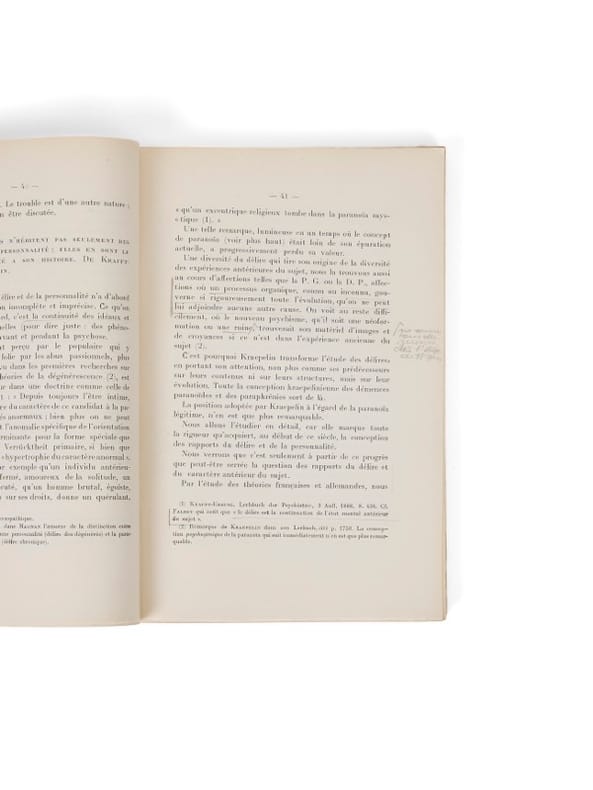 Very rare first edition, presentation-copy with an exceptional provenance, of Lacan's groundbreaking doctoral thesis, which constitutes the foundation of all his later work and inaugurated a new era in psychology and psychiatry. The copy is inscribed and signed by Jacques Lacan to professor Hesnard - highly important fellow psychiatrist famous for introducing Freud in France - in November 1932 (""à monsieur le professeur Hesnard en signe de ma respectueuse sympathie, Jacques Lacan, Ce 26 novembre 1932""). Furthermore, the copy has been in the possession of the important psychoanalyst and historian Alain de Mijolla (1933-2019) and bears his extensive notes and underlinings. Lacan, who is often referred to as ""the most controversial psycho-analyst since Freud"", ""the father of French psychoanalytical thinking"", and a towering intellectual giant of the twentieth century, plays as dominant a role in modern psychology and the development of psychological thought as Freud. It is his doctoral dissertation (the present work) that constitutes the inaugural moment in his work. ""Lacan's theoretical engagement with psychosis constitutes a central platform for his ventures into psychoanalysis"" from his doctoral thesis on paranoia in the 1930s through to his seminar on Joyce in the 1970s, the question concerning the psychoanalytic treatment of psychosis was at the forefront of his clinical work."" Aimée, Lacan's patient and subject of his thesis, bears the same importance for the history of psychology as Anna O., the patient in Freud and Breuer's ""Stydies of Hysteria"". Aimée was a thirty-eight-year-old woman, who had tried to stab the celebrated actress Huguette Duflos and was thus imprisoned, in April 1931. The story immediately reached the press, and ""Aimée"" (Lacan's pseudonym for her) became famous in the whole country. Lacan began to see her one month later at the Sainte-Anne Hospital. Through biographical inquiry, Lacan established a classic picture of her and noticed a development that would come to play a central role in his psychological theory: after three weeks of incarceration, Aimée was almost completely out of her delusional state, which Lacan considered evidence of the acute nature of her paranoia. This connection, which according to Lacan meant that she found consolation only in her punishment, not in the act itself, caused Lacan to propose a new diagnostic category, namely ""self-punishment paranoia."" ""It [i.e. ""De la Psychose Paranoïaque""] took on the importance that had previously been accorded to studies in hysteria in the rise of the international movement. Just as Freud had given hysteria its patents of nobility in endowing it with full-fledged existence as an illness, so Lacan, forty years later, gave paranoia, and more generally psychosis, an analogous place within the French movement"" (E. Roudinesco: La Bataille de cent ans, l'histoire de la psychanalyse en France, Vol. 2, p. 114). With Lacan's doctoral dissertation, Aimée quickly became a cause celebre for the surrealists. In the ""De la Psychose Paranoïaque"", Lacan also included a selection of Aimee's copious writings, which were produced at the height of her psychosis. This also contributed to the immediate importance of the work and to the spreading of Lacan's novel theories. ""Certainly it was this feature which was seized upon by its first surrealist readers, and which gave to this medical thesis right from the start a position in contemporary, even avant-garde thinking, which was markedly different from the usual dustgathering oblivion that is the fate of such work."" (Olga Cox-Cameron: Lacan's Doctoral Thesis: Turbulent Preface or Founding Legend?) ""Jacques Lacan is regarded as the father of French psychoanalytical thinking. He trained in mainstream psychiatry and his doctorate thesis was supervised by Gaétan de Clérambault. After the Second World War he became a cult figure in French intellectual circles, mixing Freudian ideas with social comment. As with many French intellectuals, he founded an ephemeral one-man movement with many followers"" (Preface to the English translation (1986)). ""Jacques Lacan (April 13, 1901 to September 9, 1981) was a major figure in Parisian intellectual life for much of the twentieth century. Sometimes referred to as ""the French Freud,"" he is an important figure in the history of psychoanalysis. His teachings and writings explore the significance of Freud's discovery of the unconscious both within the theory and practice of analysis itself as well as in connection with a wide range of other disciplines. Particularly for those interested in the philosophical dimensions of Freudian thought, Lacan's oeuvre is invaluable. Over the course of the past fifty-plus years, Lacanian ideas have become central to the various receptions of things psychoanalytic in Continental philosophical circles especially."" (SEP). Provenance: Angelo Louis Marie Hesnard (1886-1969) was an extremely important early French psychonanalyst and psychiatrist famous for his contributions to French sexology in the 30'ies and his groundbreaking early studies on Freud. He was a founding member of the Société psychanalytique de Paris, founded in 1926, and he occupies a central role in the history of modern psychoanalysis, being the co-author of the first French work on psychoanalysis and the person who introduced Freudian psychoanalysis to France. In the fifties he debated with Jacques Lacan over the meaning of Freud's saying ""Where It was, shall I be"""" but when debarred by the IPA from the roster of training analysts as a representative of the chauvinist wing of French psychoanalysis, he followed Lacan into the École Freudienne de Paris in 1964. ""HESNARD, ANGÉLO LOUIS MARIE (1886-1969)A psychoanalyst, doctor with the French Navy, and professor at the École Principale du Service de Santé de la Marine... He was coauthor of the first French work on psychoanalysis and one of the founding memb