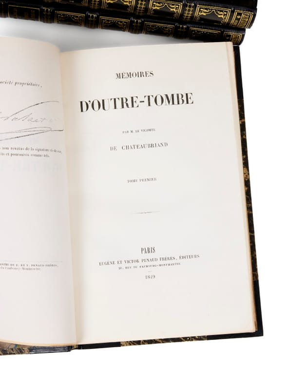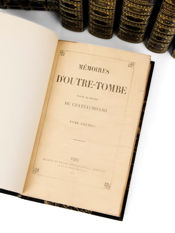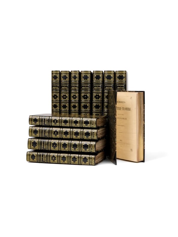 Assurément l'oeuvre la plus moderne et la plus appréciée de Chateaubriand, commencée en 1809 et poursuivie sans relâche jusque dans les dernières années, la rédaction des Mémoires s'achève en 1841, mais Chateaubriand n'a cessé d'y revenir jusqu'à sa mort en juillet 1848. Publiés d'abord en feuilleton dans La Presse, ils paraissent en volumes à partir de janvier 1849. Mêlant souvenirs de jeunesse, portraits, méditations et jugements sur les événements et les figures de son temps, les Mémoires d'Outre-Tombe constituent à la fois un récit autobiographique, une fresque historique et une réflexion métaphysique. « L'oeuvre et la personnalité de Chateaubriand (1768-1848) dominent tout le XIXᵉ siècle littéraire. (...) Une nouvelle manière de sentir et de penser, de s'exprimer et de comprendre. Il ouvrit l'ère du Romantisme » (Talvart). De Barbey d'Aurevilly, qui affirma que Chateaubriand était né « avec une étoile sur la tête », à Proust qui y voyait un modèle inégalé, les Mémoires sont universellement reconnus comme l'un des textes fondateurs de la modernité littéraire et ouvrent l'ère de l'autobiographie moderne. Bel exemplaire, très frais et merveilleusement établi : il provient du Cabinet des livres de Pierre Brossette (Paris, Christie's, 2025, n° 55). « Ouvrage très important, fort recherché, et très littéraire » Carteret, Le Trésor du bibliophile, I, p. 163 ; Vicaire, II, 290 ; En français dans le texte, 268. « L'un des textes les plus importants de la littérature du XIXe siècle », Clouzot, 66 ; Talvart, III, p. 16 ; Rahir, Bibliothèque de l'amateur, 366.