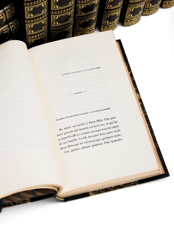 Première tirage, merveilleusement établi par Maylander.Exemplaire Pierre Brossette. Paris, Eugène et Victor Penaud, 1849-1850. 12 vol. (140 x 220 mm). Demi-maroquin à coins bleu nuit à long grain, dos à nerfs richement orné, tranches dorées, couvertures et dos conservés (reliure signée de Maylander). Édition originale. Exemplaire du premier tirage, complet de l’avant-propos de l’éditeur, de la liste des souscripteurs, de la lettre de Chateaubriand à Delloye et qui présente bien l’erreur de pagination au tome II (p. 164 au lieu de p. 364). Ces feuillets seront supprimés lorsque le solde de l’édition fut cédé au libraire Dion-Lambert.