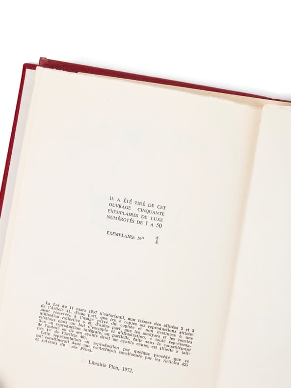 Exemplaire de tête nominatif Paris, Plon, (1er septembre) 1972. 1 vol. (145 x 215 mm) de 154 p. et [2] f. En feuilles, sous emboîtage rouge de l'éditeur. Édition originale. Un des 50 premiers exemplaire de luxe, celui-ci nominatif pour Madame Maurice Genevoix.