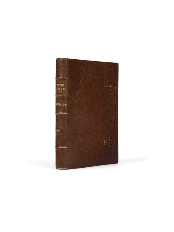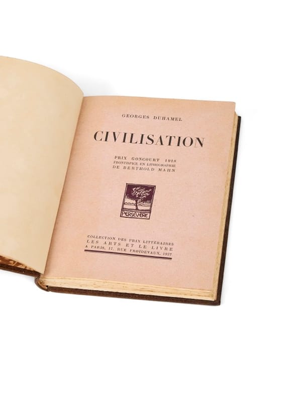 Première édition illustrée de Civilisation, publiée dix ans après l'originale, dans la collection fondée par Georges Crès. Ce dernier, à la suite d'un grave accident de voiture en 1925, avait revendu les parts de sa maison d'édition pour prendre la direction, en 1926, d'une plus petite structure : la maison d'édition Les Arts et Le Livre, reprise à son beau-frère, Henri Jonquières. Il y créera plusieurs séries, dont cette collection. Ce tirage, bien que modeste, marque l'entrée de Civilisation dans une édition de bibliothèque illustrée, à destination d'un lectorat plus large. La présence d'un exemplaire dans la bibliothèque de Maurice Genevoix souligne une fois encore l'intérêt constant qu'il porta aux récits de guerre publiés par ses contemporains. Exemplaire modeste : rousseurs sur les tranches ; trace d'une mouillure aux derniers feuillets blancs et plats légèrement cambrés. De la bibliothèque Maurice Genevoix, «Aux Vernelles», avec ex-libris.