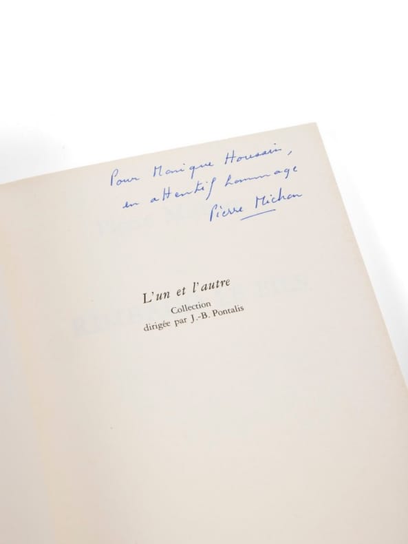 Édition originale. Envoi signé. Paris, Gallimard, coll. « L'un et l'autre », (22 octobre) 1991. 1 vol. (120 x 205 mm) de 119 p. et [4] f. Broché, sous couverture illustrée. Édition originale. Premier tirage (pas de grands papiers). Envoi signé : « Pour Monique Houssin, en attentif hommage, Pierre Michon ».