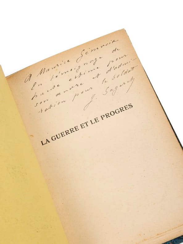 Exemplaire Maurice Genevoix avec envoi Paris, Payot & Cie, 1917. 1 vol. (115 x 180 mm) de 250 p. Demi-chagrin marine, titre doré, dos orné, tête dorée, couvertures conservées. Edition originale et premier tirage (pas de grands papiers). Envoi signé : « à Maurice Genevoix, en témoignage de haute estime pour son œuvre et d'admiration pour le soldat. J. Sageret».
