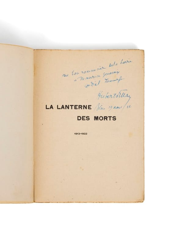 Écrivain solognot, né à Bracieux, à deux pas de Chambord, Hubert Fillay fut l’un des plus fervents défenseurs du régionalisme en Loir-et-Cher. Avocat au barreau de Blois, il fonde la revue Le Jardin de la France, puis, en 1922, l’association L’École de la Loire, qui réunit artistes et écrivains autour de l’identité du Val de Loire. Maurice Genevoix y sera naturellement associé. Ce recueil de poèmes, publié l’année même de la fondation de l’École de la Loire, rend hommage à la symbolique des lanternes mortuaires, que l’on trouvait jadis à l’entrée des cimetières et sur les tombes. Plusieurs poèmes sont consacrés aux soldats morts au front, dans une veine élégiaque et locale à la fois. Il est probable que Fillay ait offert cet exemplaire à Genevoix après avoir lu Rémi des Rauches, paru peu auparavant, et qui marquait un tournant régionaliste dans l’œuvre du romancier.