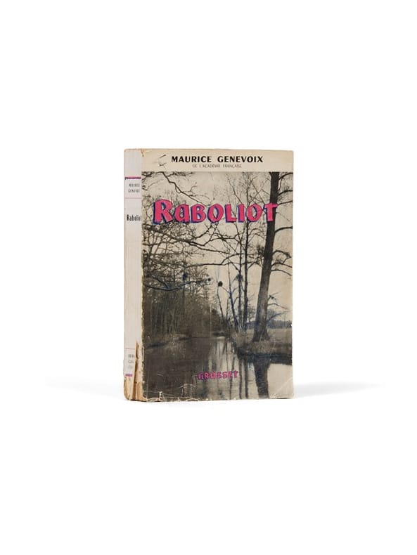 Paru dans la prestigieuse collection bibliophilique de La Belle Édition, ce Raboliot s'inscrit dans un ensemble de six titres de Maurice Genevoix sélectionnés pour leur caractère « naturaliste ». Chaque volume est confié à un illustrateur différent : Routes de l'aventure, avec des aquarelles de Pierre-Eugène Clairin ; La Boîte à pêche, avec des compositions d'André Collot ; La Dernière harde, avec des compositions et gravure à l'eau-forte en frontispice par Odette Denis ; Rémi des Rauches, avec des aquarelles de Jacques Thévenet et Rroû avec des illustrations de A. D. Steinlen, - et ce Raboliot, confié aux compositions sensibles de Paul Jarach. L'exemplaire ici présenté fut imprimé spécialement pour Sylvie Genevoix et conservé aux Vernelles, la maison familiale solognote acquise par Maurice Genevoix après le succès de Raboliot. Sylvie Genevoix y est née, y a grandi, et y a vu naître son propre rapport à la nature et à l'écriture. Elle évoquera cette maison dans une préface lumineuse à La maison de mon père : « C'est dans son havre des «Vernelles», sur un coteau dominant la Loire, que l'essentiel de l'écriture et de la vie de Maurice Genevoix s'est écoulé, à l'image du fleuve qu'il contemplait depuis son bureau. C'est dans ce nid des Vernelles que je suis née, que j'ai fait mes premiers pas, la main dans la main de mon père, là qu'il m'a appris à parler, à regarder et à m'émerveiller. [...] Je me sens, à l'égard de mon père et de cette maison à son image, redevable de tant d'indicibles trésors, de tant de ces menus riens qui enchantent ou apaisent, que je ne peux être qu'un modeste porte-parole, un témoin fidèle et attentif qui tente de transmettre et de faire partager un peu de ce qu'il a reçu. » De la bibliothèque des « Vernelles » (ex-libris).
