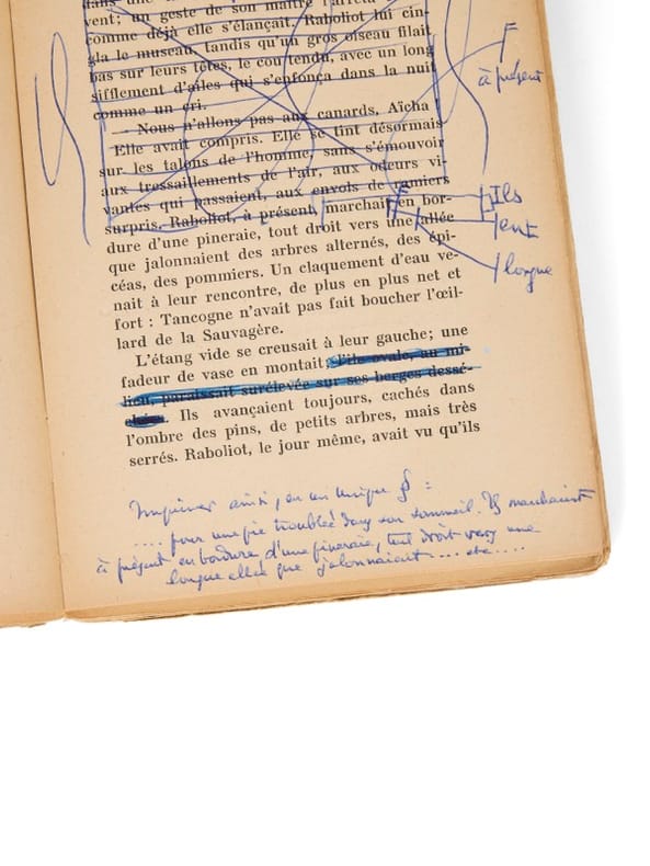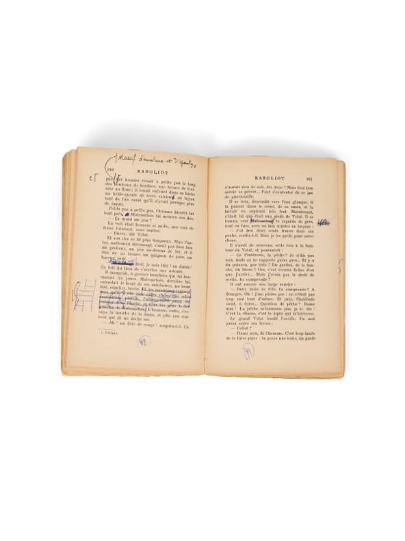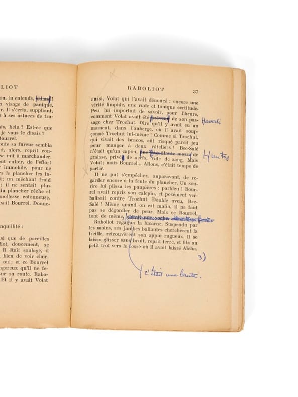 Nouvelle édition, donnant le texte définitif : exemplaire passablement annoté Paris, Grasset, (2 juillet) 1953. 1 vol. (120 x 185 mm) de 301 p., [3] et 1 f. Broché, sous couverture illustrée et étui. Exemplaire corrigé de la nouvelle édition de Raboliot, donnant l'édition ne variatur, et considérablement annoté en vue d'une lecture. Le volume comporte en tête cette note autographe : « Exemplaire revu pour la lecture au micro. Il faudra reporter les suppressions (en remaniant) sur un autre exemplaire destiné à l'édition illustrée Delagrave. Là, peut-être, retenir certaines de ces modifications (bien moindres), en prévision d'une nouvelle édition Grasset ».
