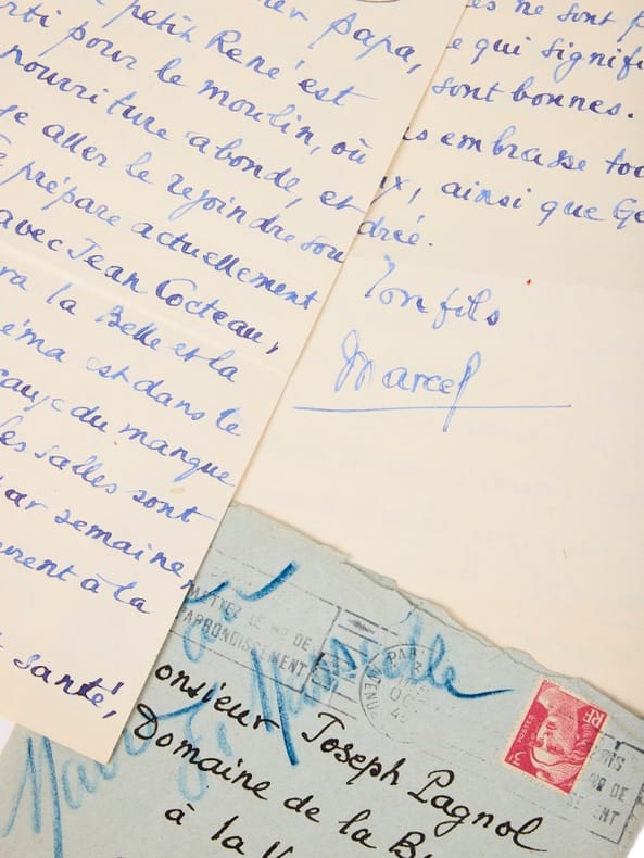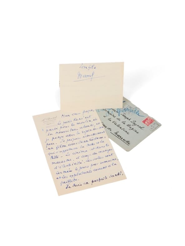 Pagnol en soutien à Cocteau pour la Belle et la bête [1945]. 4 pages en 2 feuillets (135 x 210 mm) à en-tête du Bristol. « Mon cher papa, Le petit René est parti pour le moulin, où la nourriture abonde, et je pense le rejoindre sous peu. Je prépare actuellement un film avec Jean Cocteau, qui s'appellera la Belle et la Bête. Le cinéma est dans le marasme, à cause du manque d'électricité... ».