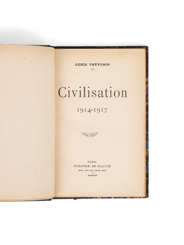 Dès la mi-décembre 1914, le médecin qu'est alors Georges Duhamel écrit à sa femme : « Je devrai à la guerre d'être sorti de mon trou habituel et d'avoir vu une collection énorme de types que rien ne pouvait me faire imaginer. » Ces premières impressions donneront lieu à son premier livre, Vie des martyrs, qui parait en avril 1917. Un titre pour lequel Genevoix exprimera son admiration, dans L'Europe nouvelle (janvier 1918). Cette expérience de chirurgien de guerre, Duhamel va l'étoffer un an plus tard pour Civilisation, sous le masque de narrateurs divers, et non combattants. Il porte un regard de compassion sur les soldats blessés et délivre un témoignage fort sur la souffrance dans les ambulances de l'arrière front. Ceci avec les réserves qu'émettra Norton-Cru dans Témoins, lequel tempère le propos enthousiaste des critiques : « Est-ce que l'auteur n'a pas joué avec trop d'insistance sur la corde de la pitié, dans un but littéraire, avec l'intention de produire des morceaux à succès ? (...) Celui qui stylise ou transpose les faits de son expérience peut prétendre faire oeuvre de littérateur, jamais de témoin. » Il n'empêche : Civilisation est couronné du prix Goncourt le 11 décembre 1918, luttant contre Koenigsmark de Pierre Benoît, Les Silences du colonel Bramble d'André Maurois et Simon le Pathétique de Jean Giraudoux. Le roman l'emporte par six voix contre quatre à Pierre Benoît, faisant définitivement renoncer Duhamel à la chirurgie pour se consacrer à l'écriture. En août 1940, Civilisation sera interdit et mis sur la liste Bernhard, avant que l'ensemble de l'oeuvre du Duhamel ne soit inscrite sur la liste Otto. À la Libération, Duhamel fera partie du Comité National des Écrivains, dont il démissionnera en 1946, désapprouvant les excès de l'épuration. L'édition originale du titre comprend les exemplaires numérotés du premier mille, auxquels s'ajoutent cinq exemplaires de tête sur chine - hors commerce - et trente-sept sur hollande. Bel exemplaire du premier tirage avec ses fragiles couvertures à l'état de neuf.