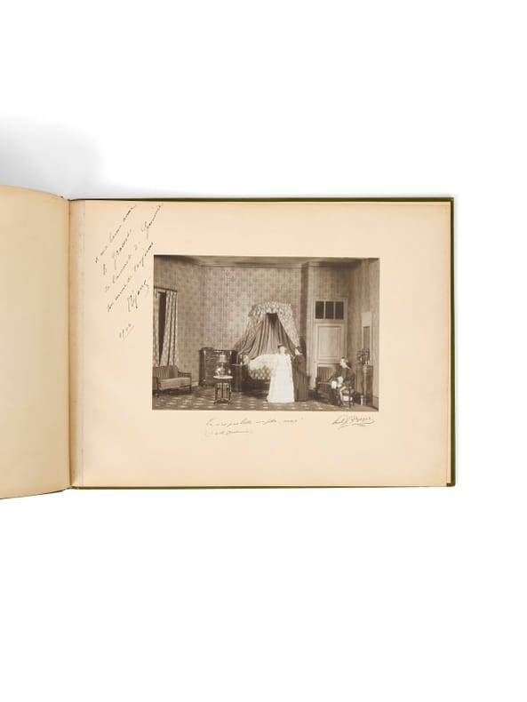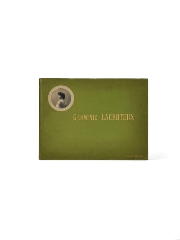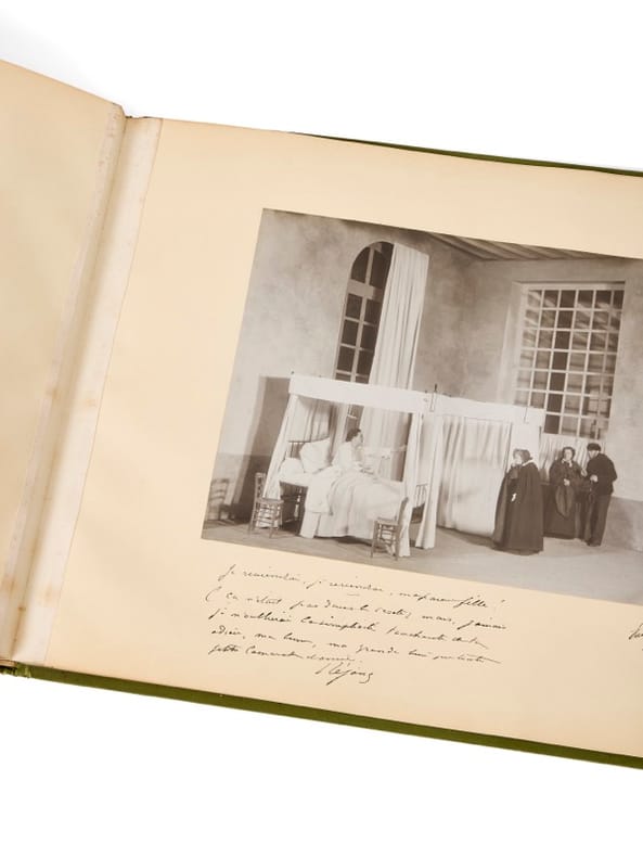 Cinq des photographies sont légendées et signées de la main de Réjane, qui y a recopié les vers de la scène représentée. Cette réunion de photographies, rare témoignage des quelques représentations données avant l'arrêt de la pièce sur recommandation de la censure, restitue la mémoire d'une aventure théâtrale mouvementée et précieuse. Créée le 23 décembre 1888, la pièce Germinie Lacerteux - adaptée du roman naturaliste des frères Goncourt - fut accueillie fraîchement par le public et violemment par la critique, qui en fit un scandale. Le Sénat réclama la suppression de la pièce et blâma les censeurs qui en avaient autorisé la représentation. Elle fut définitivement interdite le 5 février 1889. Ce soir-là, pourtant, parmi les rares soutiens enthousiastes de la troupe se trouvait Marcel Proust, venu féliciter Réjane. Celle-ci, devenue plus tard son modèle pour le personnage de la Berma, lui prêtera en 1919 un appartement dans sa maison de la rue Laurent-Pichat, où il recevra les premières épreuves de Guermantes. Seize ans plus tard, en 1903, la pièce est reprise au Théâtre du Vaudeville, toujours avec Réjane dans le rôle-titre et sa fidèle partenaire Daynes-Grassot. Cette fois, la critique est unanime, admirative : « rien que pour Mme Réjane il valait la peine de remonter Germinie Lacerteux pour quinze jours ; et rien que pour Mme Daynes-Grassot, il était opportun de la représenter pour deux semaines : il faut que les amateurs de théâtre aient vu Mme Grassot et Mme Réjane », écrit René Mazeroy dans Gil Blas. Paul Boyer immortalise la troupe et ces instants de gloire retrouvée ; Octave Mirbeau saluera cette renaissance dans la plaquette collective À Réjane. L'année suivante, Réjane rachètera le Nouveau-Théâtre de Lugné-Poe, qu'elle rebaptisera Théâtre Réjane après de grands travaux, y créant notamment L'Oiseau bleu de Maeterlinck et reprenant Madame Sans-Gêne, son rôle fétiche. Cet album, offert à sa « camarade de toujours » est accompagné de trois coupures de presse contemporaines saluant la reprise de la pièce et le jeu des deux actrices ainsi que d'une brochure d'hommage pour les 88 ans de Daynes-Grassot, lorsqu'elle remonta une ultime fois sur scène dans La Belle aventure. Coins de l'album émoussés.