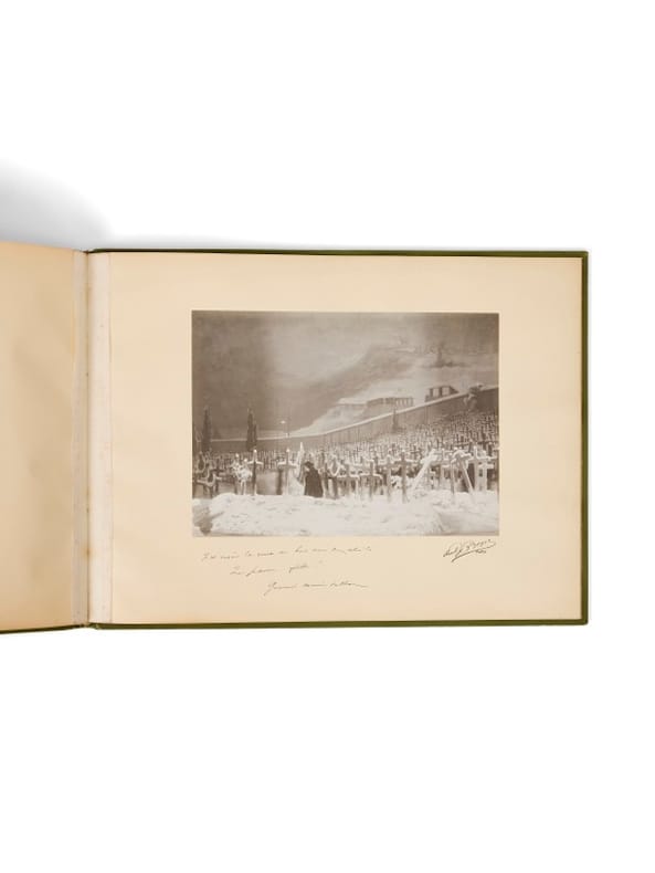 Album unique avec tirage originaux, signé par Réjane [Paris, Paul Boyer, 1903]. 1 album oblong (455 x 345 mm). Percaline verte ornée d'un médaillon photographique, titre doré au premier plat. Exceptionnel album de douze tirages photographiques originaux en noir, par Paul Boyer, contrecollés sur papier japon et montés sur onglets. Envoi signé : « à ma bonne amie B. Grassot, sa camarade de Germinie, son amie de toujours, Réjane, 1904 ».