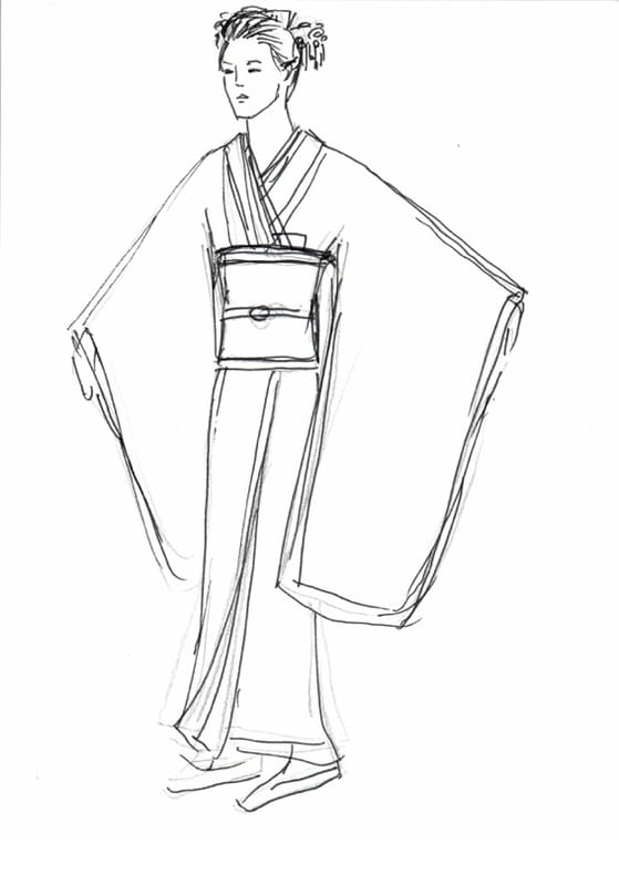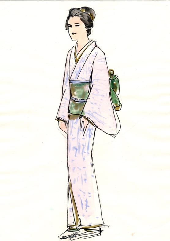 1 feuillet (210 x 285 mm), crayon, feutre et aquarelle. Geisha en costume traditionnel. Mention au dos du feuillet : « Suzuki version I acte I ».