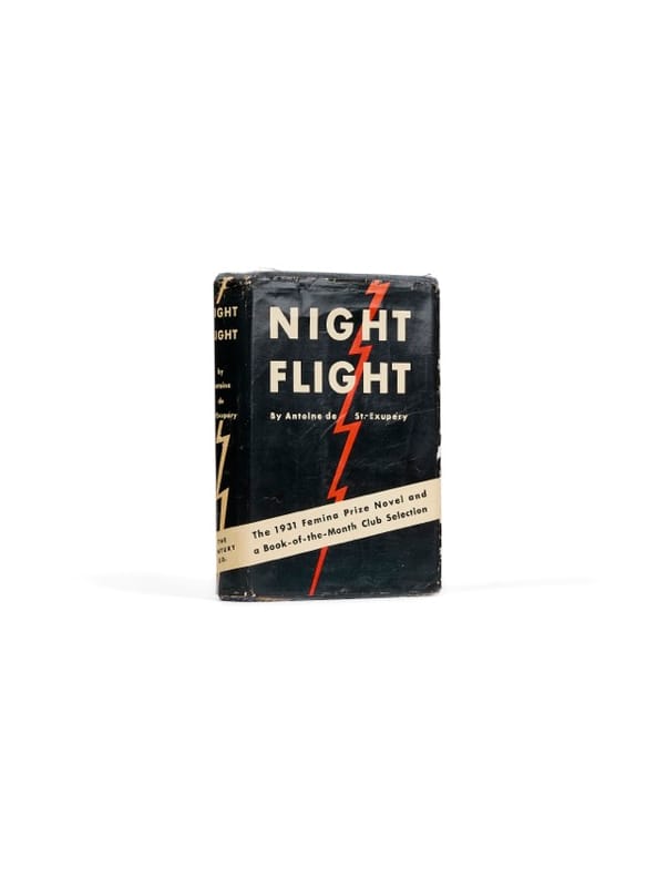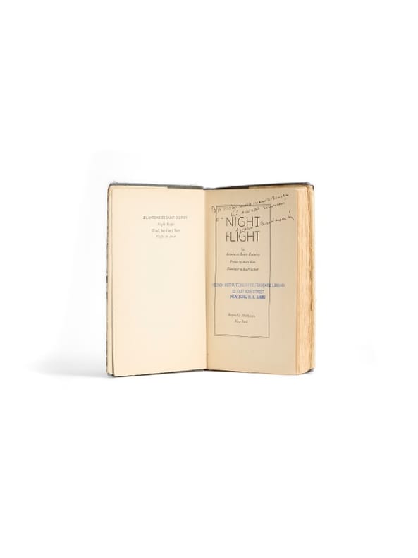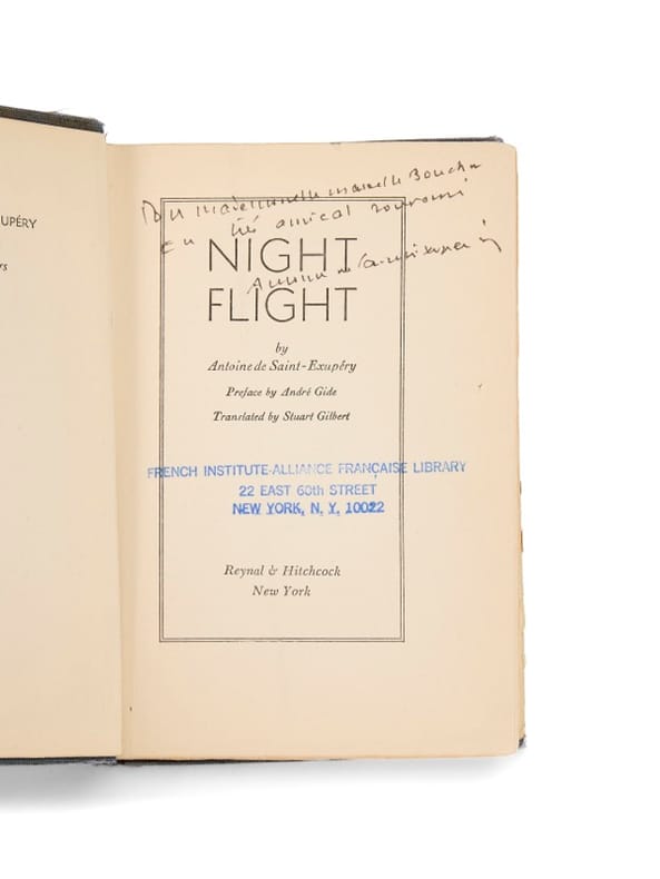 En 1929, devenu directeur de l'exploitation de la compagnie « Aeroposta Argentina », Antoine de Saint-Exupéry a pour mission d'ouvrir une ligne vers la Patagonie et la Terre de Feu, quelque 2500 kilomètres au sud de Buenos Aires. C'est en Argentine qu'il écrit les premières lignes de Vol de nuit, dans l'appartement 605 de l'historique Galería Güemes, dans le centre de Buenos Aires, où il s'installe au cours de l'année 1929, une fois nommé directeur de « l'Aeroposta Argentina». Un an plus tard, il rencontre, lors d'un événement organisé à l'Alliance française de Buenos Aires, sa futur femme, Consuelo Suncín, sa « rose » ; il se marie avec la jeune femme, d'origine salvodorienne, en avril 1931, un mois avant la parution de Vol de nuit aux éditions Gallimard. L'ouvrage, préfacé par André Gide, reçoit les faveurs du public et de la critique, recevant le prix Femina. Vol de nuit se vend à plus de 150 000 exemplaires et, immédiatement traduit aux États-Unis, devient un best-seller, retenu dans la sélection du Book of the Month Club. En janvier 1941, Antoine de Saint-Exupéry décide de quitter définitivement la France occupée et de s'établir à New York. Il travaille aux dernières lignes de Flight to Arras, qui paraît en janvier 1942 dans la revue Atlantic Monthly, puis en volume le mois suivant : c'est un nouveau best-seller, qui permet à Antoine et Consuelo de Saint-Exupéry de s'installer à la fin de l'année dans l'appartement de Greta Garbo à Beeckman Place, à New York, où ils recevront et rencontreront les élites de la société new-yorkaise. Plusieurs événements auront lieu à l'Alliance française en fin de l'année 1942 et au début de l'année 1943, juste avant que Saint-Exupéry ne quitte New York. Il s'agit donc ici d'une des dernières dédicaces qu'il ait pu faire sur place. L'exemplaire provient de la collection de William Scherry, grand spécialiste américain de Saint-Exupéry, lecteur à l'Alliance française et fondateur de l'association « Remembering Saint-Exupéry», qu'il a dirigée de 1998 à 2010. Timbre humide bleu à la page de titre, « French Institute-Alliance française Library, 22 East 60th Street, New York, NY 10022».
