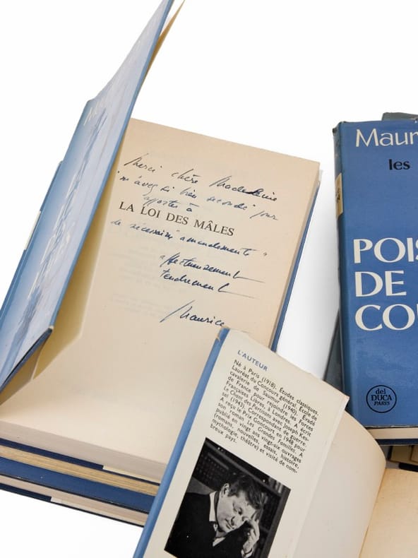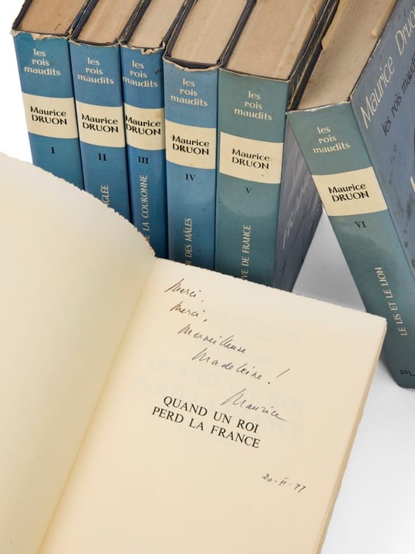 D'un secrétaire perpétuel à un autre.Les Rois Maudits, exemplaire Genevoix Paris, Del Duca, 1965-1966. 7 vol. (140 x 210 mm). Cartonnages et jaquettes illustrées de l'éditeur. Première édition Plon. Tous les volumes sont dans le premier tirage. Envois signés sur cinq tomes : « À Monsieur et Madame Maurice Genevoix qui habitent glorieusement et pour l'agrément de leurs amis, à l'emplacement de l'ancien Hôtel de Nesle où se déroule en partie ce récit. Hommage d'affection, Druon, 1966 » ; « À Monsieur et Madame Maurice Genevoix, pour qu'ils trouvent à leur retour d'Ibérie, sous cette tente des Rois maudits, les pensées très chaleureuses de leur admirateur affectueux, Druon, Juillet 1966 » ; « À Monsieur et Madame Maurice Genevoix, avec mes souhaits d'une heureuse fin d'été devant leur immense miroir de Loire, et pour leur renouveler mon très affectueux attachement, Druon, Juillet 1966 » ; « À Monsieur et Madame Maurice Genevoix pour porter sur ce livre sorti des presses le jour même du scrutin de Décembre, le témoignage de mon immense gratitude, de ma joie, et de mon très affectueux dévouement, Maurice » ; « À mes chers Maurice et Suzanne Genevoix, amis, en hommage de fervente affection, Maurice ».