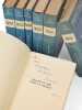 Merveilleux exemplaire, offert tout au long de la parution des volumes à celle qui se mua d'une fidèle collaboratrice en épouse attentionnée. vol. I : «Merci, chère Madeleine de toute l'aide que vous m'avez donnée pour cette nouvelle édition. Je vous embrasse, Maurice». vol. II : «Pour vous, chère Madeleine, sans qui [La Reine étranglée] ne serait pas ce qu'elle est devenue, dans sa robe tissée de neuf. Très affectueusement, Maurice». vol. III : «Pour Sainte Madeleine de Grenelle, patronne des correcteurs d'épreuves, consolatrice des écrivains en mal de révision, auxiliatrice des Rois Maudits, en signe de bonne fête, Maurice, 22 juillet 1966». vol. IV : «Merci chère Madeleine qui m'avez si bien secondé pour apporter à [La Loi des mâles] de nécessaire "amendements". Afffectueusement, tendrement, Maurice». vol. V : «Pour ma chère Madeleine qui fut de toutes les aventures de cette "Louve", première et seconde manière, her tender boss and grateful too, Maurice». vol. VI : «À vous, chère Madeleine, pour le grand "ouf" que nous poussâmes quand ce sixième Roi de papier fut achevé, en souvenir des quatorze mille pages d'épreuves nécessaires... sur le chemin du quai Conti. Tendrement, Maurice». Le dernier tome, paru en 1977, est l'un des rares 70 exemplaires en grands papiers de l'édition originale. Il est également envoyé à celle qui est maintenant sa femme depuis près de 10 ans : ce dernier volume contient cet envoi qui résume l'implication de Madeleine à l'aventure de cette épopée des Rois maudits : «Merci, merci, merveilleuse Madeleine ! Maurice, 20.II.77». Née en Espagne dans une famille de souche paysanne du Sud-Ouest, Madeleine Mérignac est la fille d'un officier de la Légion d'honneur mort prématurément. Élevée dans la rigueur, elle reçoit une instruction exigeante à la Maison d'éducation des Demoiselles de la Légion d'honneur, avant de suivre une formation de secrétaire chez Pigier. Rapidement indépendante, elle vit modestement rue de Grenelle, à quelques rues de Maurice Druon.Elle rencontre ce dernier à la parution des Grandes Familles et devient sa secrétaire, dactylographiant ses manuscrits puis sa correctrice. Présente à chaque étape de la rédaction des Rois Maudits, elle en devient une collaboratrice discrète mais constante. Son nom figure du tome I au tome VI - performance qu'elle ne partage qu'avec Pierre de Lacretelle et Georges Kessel. Elle devient au fil des ans sa confidente, puis sa maîtresse, suppléant Edmonde Charles-Roux dans le coeur de Druon. La relation devient officielle en 1967, quand il rentre à l'Académie française, et le couple se marie l'année suivante. Excellent état, tous les volumes sont en premiers tirages de cette deuxième édition des Rois Maudits (pour les six premiers tomes), la première collective. C'est par ailleurs la première fois que nous rencontrons les jaquettes en service de presse, qui sont légèrement différentes de celles mises dans le commerce.