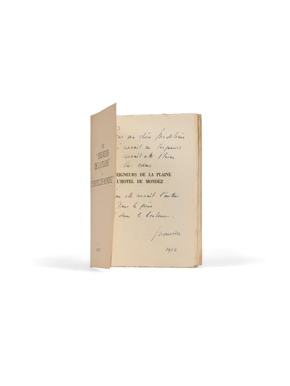 Exemplaire de tête de son premier texte offert à sa future femme Paris, Julliard, (26 janvier) 1962. 1 vol. (150 x 2025 mm) de 285 p. et [1] f. Broché, non coupé. Édition originale. Un des 50 premiers exemplaires sur alfa d'Avignon, celui-ci un des hors commerce réservés à l'auteur. Envoi signé : «Pour ma chère Madeleine qui connaît ces Seigneurs et connaît cette Plaine par cœur, comme elle connaît l'auteur dans la peine et dans le bonheur. Maurice, 1962».