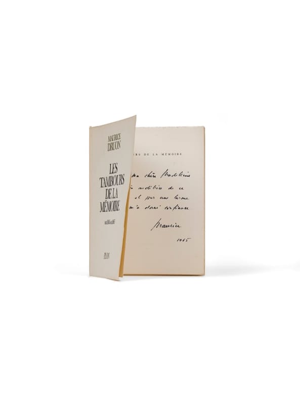 Publié entre deux volets de sa série des Rois maudits, Les Tambours de la mémoire est un récit plus personnel et introspectif, dans lequel Druon s'interroge sur les bruissements de l'histoire dans la conscience des vivants. Son style y fait entendre ces fameux « tambours » qui résonnent de génération en génération : l'écho des morts, des défaites, des engagements, des honneurs perdus ou transmis. C'est aussi un texte sur la mémoire collective, le poids du passé, et les héritages invisibles que les individus, souvent à leur insu, portent en eux. L'année suivante, Druon est pressenti pour intégrer la coupole de l'Académie française : il y sera élu en 1967. Touchant exemplaires offert et adressé à Madeleine Mérignac, secrétaire, compagne puis épouse de l'écrivain. Elle joua un rôle essentiel dans la vie littéraire et personnelle de Druon, comme en témoigne ici cette allusion poétique à son soutien - « une larme qui m'a donné confiance » - ainsi qu'à son rôle décisif dans l'édition du texte, peut-être même à titre de première lectrice et inspiratrice.