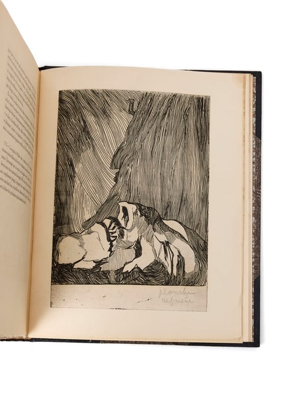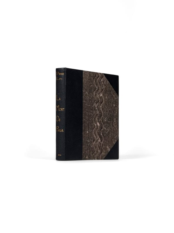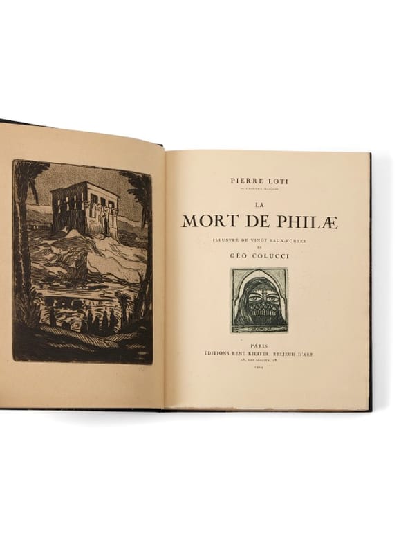 Avec une planche refusée Paris, René Kieffer, (20 mars) 1924. 1 vol. (220 x 270 mm) de 163 p. et [2] f. Demi-chagrin noir à coins, titre doré, date en pied, tête dorée, couvertures et dos conservés (reliure signée de M. Poupelin). Première édition illustrée du célèbre récit de voyage de Pierre Loti, ornée de 20 eaux-fortes originales de Géo Colucci, tirées en taille-douce et d'une vignette gravée. Un des 460 exemplaires sur vélin à la forme (non justifié), celui-ci enrichi d'une gravure supplémentaire, justifiée «planche refusée».