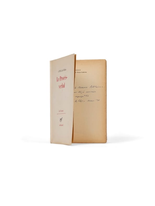 Premier roman de J.-M.G. Le Clézio, Le Procès-verbal reçut le prix Renaudot à sa parution. Il est salué comme une oeuvre neuve, dérangeante, d'une grande densité formelle et marque avec éclat l'entrée en littérature d'un jeune homme de 23 ans, dont le manuscrit était resté près d'un an dans un tiroir avant que le comité de lecture de Gallimard, sous la houlette de Jean Grosjean et Georges Lambrichs, ne le retienne. Sa publication dans la collection « Le Chemin » - dirigée par Lambrichs - n'est pas anodine : elle l'inscrit dans une nouvelle forme de littérature sensible au réel qui narre la trajectoire énigmatique d'Adam Pollo, un être aux frontières de la société, de la folie et de la révolte, qui semble « ne pas trop savoir s'il sort de l'armée ou de l'asile psychiatrique ». Un récit halluciné, saturé d'images, de ruptures de ton, de visions et de méditations existentielles. Pollo est une figure en errance dans un monde qui n'a plus d'ancrage, ni politique, ni moral, ni poétique. Dans une confession livrée au Point des décennies plus tard, Le Clézio évoque le contexte intime et historique de la rédaction : « C'était une drôle d'époque. [...] J'écrivais Le Procès-verbal par bribes, dans le fond d'un café, en y mêlant des morceaux de conversation entendus, des images, des découpes de journal. [...] Le roman a été fini après les accords d'Évian, quand j'ai compris que la menace s'arrêtait, que nous allions vivre. » Derrière l'écriture fiévreuse, il y a donc la guerre d'Algérie, omniprésente, étouffante, destructrice. Plusieurs camarades de l'auteur partent au front - certains ne reviennent pas. La guerre traverse le roman comme une onde de choc silencieuse et livre une plongée mentale et critique de la société post coloniale. Entre errance et sidération, il est à lire comme l'acte inaugural d'un écrivain qui ne cessera par la suite d'interroger les frontières. Bel exemplaire du premier tirage, avec envoi.