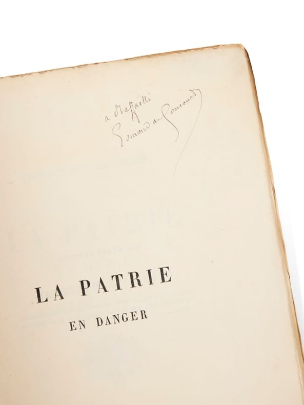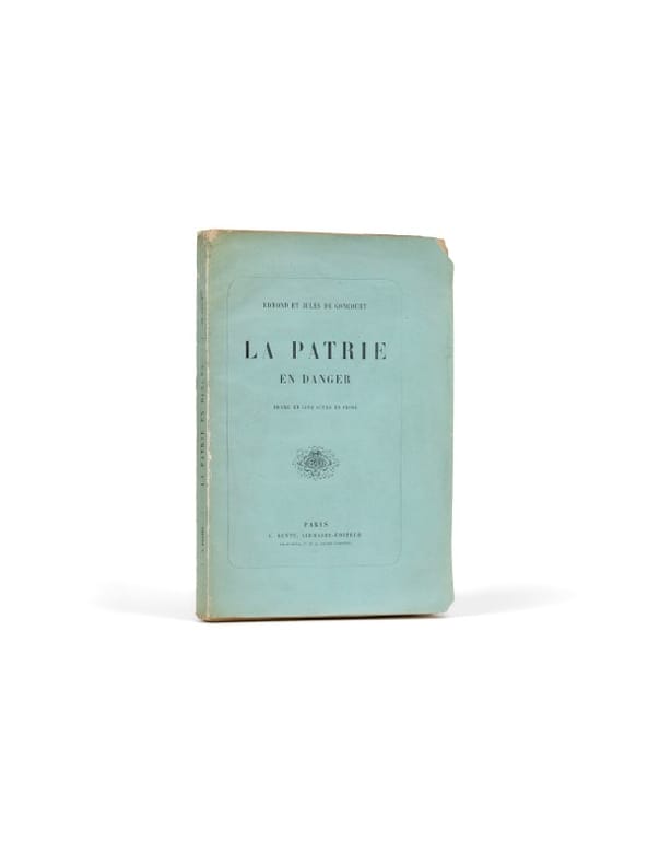 C'est le 27 décembre 1860, ainsi que le rapporte leur Journal, que les frères Goncourt évoquent leur future « pièce de la Révolution », primitivement intitulée « Blanche de la Rochedragon ». Après un refus au Théâtre-Français en 1868, elle est enfin publiée en 1873, sous le titre définitif de La Patrie en danger (une « vraie » marquise de la Rochedragon avait en effet protesté), qui reçoit les éloges d'un Maupassant dont la lecture en 1879 lui « a donné un désir intense de voir cette oeuvre sur la scène ». Rare exemplaire en tirage de tête, et d'intéressante provenance : Christian Galantaris a recensé, dans Les Goncourt dédicateurs onze exemplaires de La Patrie en danger avec envoi, dont cet exemplaire Raffaëlli : ce dernier est le seul dédicacé, dans l'inventaire Galantaris, qui soit imprimé sur hollande, malgré d'autres dédicataires prestigieux comme George Sand, Charles Asselineau, Victor Hugo, Charles Monselet ou Jules Claretie. Cette particularité montre toute l'estime que Goncourt portait à Raffaëlli. Nous avons depuis croisé d'autres exemplaires dédicacés : ceux d'Alphonse Daudet, Poulet-Malassis et Ernest Renan. Plus un seul, enfin sur hollande, celui envoyé à Paul de Saint-Victor. L'exemplaire Paul de Saint-Victor et celui de Raffaëlli sont donc, à ce jour, les deux seuls sur hollande avec envoi. Jean-François Raffaëlli était apprécié des naturalistes. Il illustra pour eux un important recueil, Les Types de Paris (et des textes de Zola, Huysmans, Goncourt, Maupassant) et, en 1889 pour les Goncourt, Germinie Lacerteux, avec dix eaux-fortes originales, en trois exemplaires seulement : une sorte de « manuscrit enluminé » avant l'heure, commandé par le bibliophile Paul Gallimard, dont le souvenir prendra place dans le Journal des Goncourt : « Vendredi 21 juin [1889]. - Déjeuner à Asnières, chez Raffaëlli, avec le ménage Gallimard, à l'effet d'ordonner et de régler l'illustration de l'édition de Germinie Lacerteux (...). Le logis de Raffaëlli, une petite maison bourgeoise de banlieue, sans rien de la bibeloterie ou de la faïencerie ordinaire des ateliers, mais où est posé sur un chevalet, ou accroché, çà et là, aux murs pour la vue, dans un cadre joliment doré, un paysage d'Asnières ou de Jersey, le plus souvent peint aux crayons de couleur à l'huile de Faber, un paysage qui a l'air d'un pastel fixé. Dans ce monde des bibliophiles, dans ce monde de domestiques du vieil imprimé, c'est vraiment un révolutionnaire que ce Gallimard, qui va dépenser 5 000 francs, pour se donner, à l'instar d'un fermier général, pour se donner à lui seul, une édition de luxe moderne... ». Provenance : Jean-François Raffaëlli (envoi) ; Pierre Bérès (cat. 17, 1937, n° 130) ; Daniel Sicklès (vente XII, 1992, n° 4816). Vicaire, III, 1055 ; Oberlé, 529 ; Galantaris, Les Goncourt dédicateurs, n° 343.