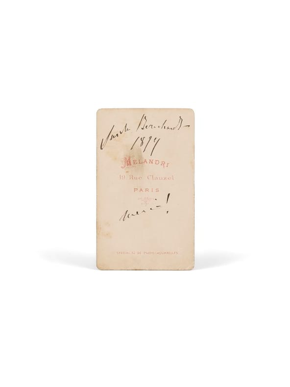Portrait avec mot autographe signé [Paris, c. 1880]. 1 tirage (60 x 90 mm) contrecollé sur carton (65 x 105 mm) de l'atelier : «Mélandri 19 rue Clauzel Paris». Le portrait est signé et daté à l'encre noire de la main de l'actrice : «Sarah Bernhardt 1894. Merci !».