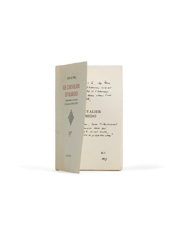Cette dédicace, au coeur de l'année du Nobel, résume évidemment l'amitié, mais surtout l'alliance d'éthique et d'esthétique qui gouverne la période : Camus dramaturge, metteur en scène et traducteur, ancre son travail dans une fidélité d'amitié, d'histoire et de théâtre. Dès ses débuts algérois, Camus rêve de plein air, d'une scène populaire où la parole « marche vers sa fin » ; l'Espagne l'accompagne très tôt (de Révolte dans les Asturies à La Célestine montée avec l'Équipe), avant qu'une première collaboration décisive n'ait lieu en 1953 : Marcel Herrand lui commande l'adaptation de Calderón, La Dévotion à la croix, coup d'envoi d'un cycle hispanique qui culminera avec Lope de Vega en 1957 et ce Chevalier d'Olmedo. À Angers, Camus est la figure centrale de la 6e édition du Festival (21-30 juin 1957) : il y remanie et met en scène Caligula pour la première fois et dirige sa propre adaptation du Chevalier d'Olmedo. La « première » demeure, de manière légendaire, datée au 21 juin mais un orage d'une violence rare arrache décors et inonde plateau et gradins au moment d'allumer les remparts : la représentation est annulée, si bien que le festival s'ouvrira in fine le 22 par Caligula, et la vraie première d'Olmedo a lieu le 23 juin (puis les 26 et 29). Sans en « oublier le côté populaire », écrit-il en marge de ses brouillons sur la pièce. Car Olmedo vient nourrir le projet d'une tragédie moderne où « un seul sentiment marche sans arrêt vers sa fin », et préfigure le répertoire que Camus, à la fin de 1959, cerne pour la direction de théâtre qu'on s'apprête à lui confier : Lope (encore), Calderón, Tirso de Molina... Robert Kemp, dans sa critique de la pièce donnée dans Le Monde, saluera le rythme, la fraîcheur et l'innocence du texte de Lope servis par « la plume solide, aiguë » de Camus - la même qui vient d'écrire, sur la peine de mort, des pages fortes et saisissantes, qui ne convaincront pas les mainteneurs de la guillotine, mais exalteront les abolitionnistes. Rien d'anecdotique : Camus note que le dernier mot de la pièce - teatro - signifie aussi échafaud ; les tréteaux sont un gibet. « Il vaudrait mieux que l'exécution fût publique. Le comédien qui est en chaque homme pourrait alors venir au secours de l'animal épouvanté et l'aider à faire figure, même à ses propres yeux », écrit-il dans Réflexions sur la guillotine, dont la rédaction est strictement contemporaine. Ainsi, la fin de l'adaptation d'Angers n'est pas sans rappeler un motif qui parcourt l'oeuvre entière de Camus, du dernier voeu de Meursault, au pied de l'échafaud dans L'Étranger, jusqu'au rêve d'exécution publique dont parle Clamence à la fin de La Chute, publiée l'année précédente. Magnifique provenance. Cet envoi est l'une des 43 connus à René Char, l'ami, le frère : cette dédicace est, de loin, la plus longue des 43 référencées.
