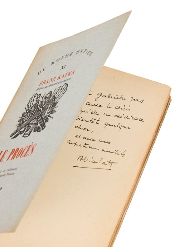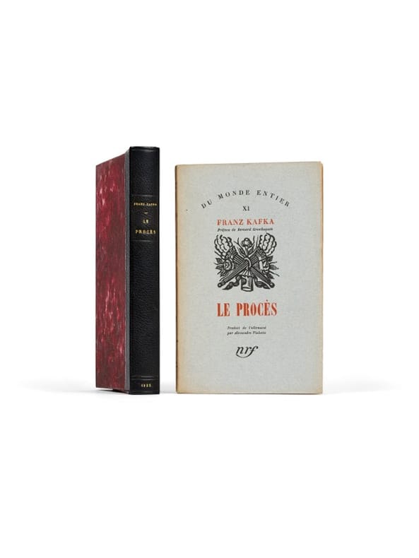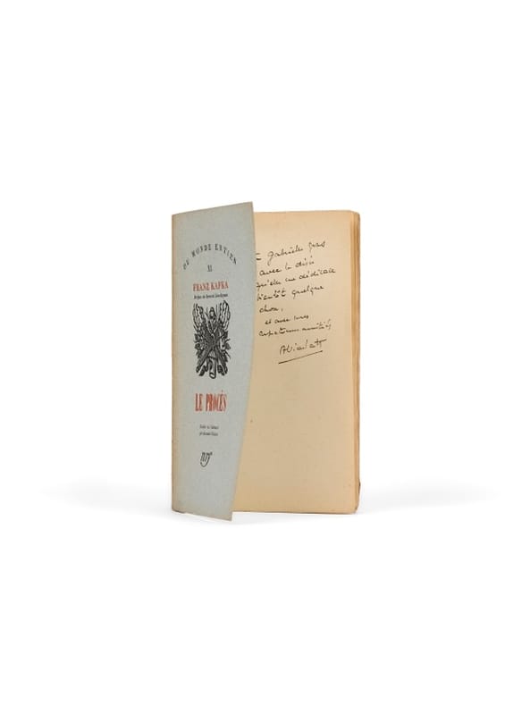 « Très cher Max, ma dernière requête : Tout ce que je laisse derrière moi doit être brûlé sans être lu » : Franz Kafka meurt le 11 juin 1924 au sanatorium de Kierling, l'actuelle Klosterneuburg, près de Vienne. Moins d'un an après, Max Brod publie contre les dernières volontés expresses de son ami le texte du Procès. Le sacrilège est aujourd'hui oublié ou pardonné, dit-on, et tout admirateur de l'oeuvre de Kafka le remercie secrètement du parjure. La traduction française paraîtra sept mois après l'arrivée au pouvoir d'Hitler. Belle provenance que celle de Gabrielle Gras, célèbre libraire niçoise qui tenait la fameuse Librairie Paradis, au 12 rue de France. Elle est la compagne puis l'épouse (en 1957) de Pierre Abraham : frère de l'écrivain Jean-Richard Bloch, il publia en 1929 aux éditions Rieder un essai sur Balzac et en 1930 un essai sur Proust ; il traduisit également Brecht en français. Résistant et figure des Lettres à Nice pendant la guerre, il y dirigera un service de renseignements communiquant avec Londres et Alger. Il sera promu par le général de Gaulle commandant en septembre 1943, et lieutenant-colonel de l'armée de l'air en mars 1945. Voici ce qu'en dit Elsa Triolet : « À Nice même, Pierre Abraham et Gabrielle Gras avaient été amenés à tenir, rue de France, une librairie vivante comme un journal clandestin, les passants y amenant des nouvelles de Paris et d'ailleurs. Les Abragras, comme je les appelais, habitaient du côté du Paillon, un vrai appartement ; nous y allions dîner parfois ». Les exemplaire de tête avec envoi du Procès sont rares. On n'en connaît que cinq autres : Gaston Gallimard, Jean Pauhlan, Bernard Groethuysen, Henri Pourrat et à son épouse Hélène Vialatte. Dos passé, sinon bon exemplaire, dans un coffret des ateliers Laurenchet.