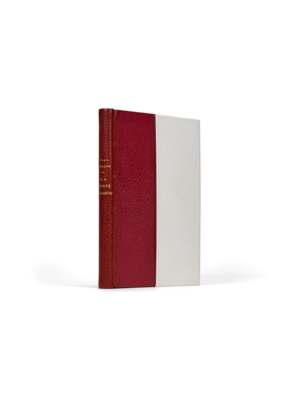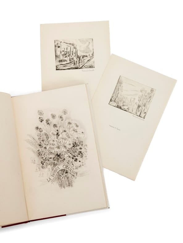 La Bonne Chanson est le quatrième recueil en vers de Paul Verlaine, publié en 1870 à Paris à compte d'auteur chez Alphonse Lemerre. Court ensemble composé de l'hiver 1869 au printemps 1870, il réunit 21 poèmes adressés à Mathilde Mauté de Fleurville (16 ans), que Verlaine épousera le 11 août 1870. Achevé d'imprimer le 12 juin 1870, le volume ne sera effectivement mis en vente qu'en 1872, Lemerre ayant refusé de paraître pendant la guerre et la Commune. En revanche, Verlaine sera déjà en conflit avec sa jeune femme : aucune des promesses de bonheur évoquées dans cette Bonne chanson ne sera tenue et le couple divorcera en 1874. Recueil lyrique par excellence, il chante l'espoir d'une vie nouvelle par la grâce de Mathilde et d'un printemps intérieur qui gagne jusqu'au Paris « malade ». Victor Hugo, destinataire d'un exemplaire, salua l'ouvrage d'une image fameuse: « une fleur dans une grenade ». Gabriel Fauré en tirera, entre 1892 et 1894, un cycle de neuf mélodies sous le même titre La lecture d'Hermine David (1886-1970) épouse ici la ferveur limpide du cycle dédié à Mathilde : silhouettes graciles, ligne souple, visages en demi-teintes. Très bel exemplaire, celui de l'artiste, enrichi de délicates épreuves signées et réhaussées. Carteret, Illustrés, IV, 392.