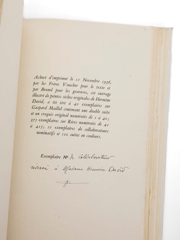 L'exemplaire nominatif de l'artiste avec gravure signée et suite Paris, Creuzevault, (11 novembre) 1936. 1 vol. (160 x 250 mm) de 45 p., 1 et [2] f. + suite. Demi-maroquin framboise, titre doré, tête dorée, plats papier glacé blanc, filet vertical à froid sur les plats, couvertures et dos conservés (reliure de l'époque). Première édition illustrée. 21 pointes sèches originales d'Hermine David. Un des 10 exemplaires de collaborateurs, celui-ci nominatif pour l'artiste (justifié et signé par l'éditeur) sur Gaspard-Maillol comprenant : une double suite des illustrations, en noir et en couleur, 1 pointe sèche signée et réhaussée en couleur par l'artiste, 1 épreuve d'essai justifiée et signée et 1 tirage supplémentaire, signé.