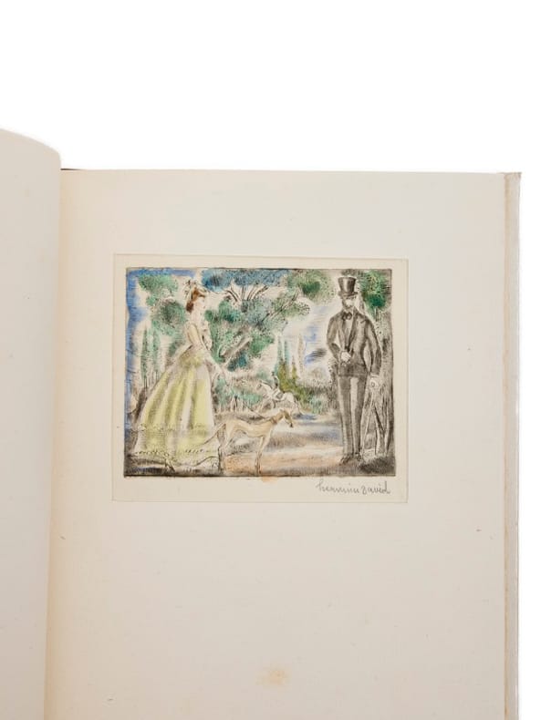 1844 Zurich: Edition d'art Louis Grosclaude, coll. Le Livre du centenaire (1844-1944), 1944. En feuilles sous chemise et étui: 85-[4] pp. + 55 ff pour la suite. Edition richement illustrée de 55 compositions originales de Roger Ferrero lithographiées en sanguines ou en noir, dont 4 hors-texte réhaussés à la main en couleurs. Tirage limité à 180 exemplaires. Celui-ci, un des 25 exemaplaires sur papier Guarro contenant la suite des illustrations sur Japon, signés par l'éditeur et l'artiste (no. 24). Exemplaire est truffé de deux dessins originaux exécutés au crayon rose et de deux autres dessins originaux à l'encre de chine réhaussés à l'aquarelle. Complet du feuillet de souscription. Chemise en demi-parchemin à dos carré portant l'auteur en lettre dorés. Plats recouverts de papier écru. Etui assorti. En excellent état.